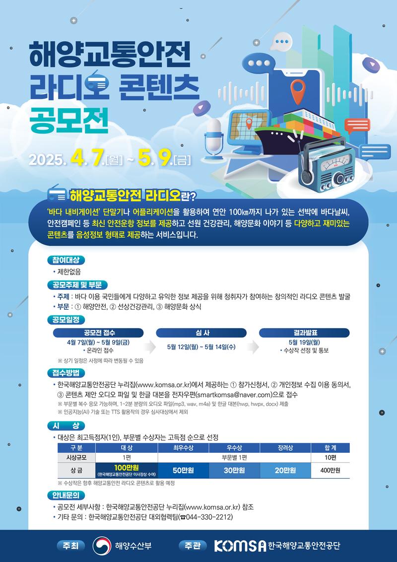 ⑩ 출품작의 저작권은 응모자에게 있으며, 해양수산부와 한국해양교통안전공단은 방송 편집 및 송출 권한을 가지며, 해당 자료는 추후 라디오 콘텐츠로 활용될 수 있음