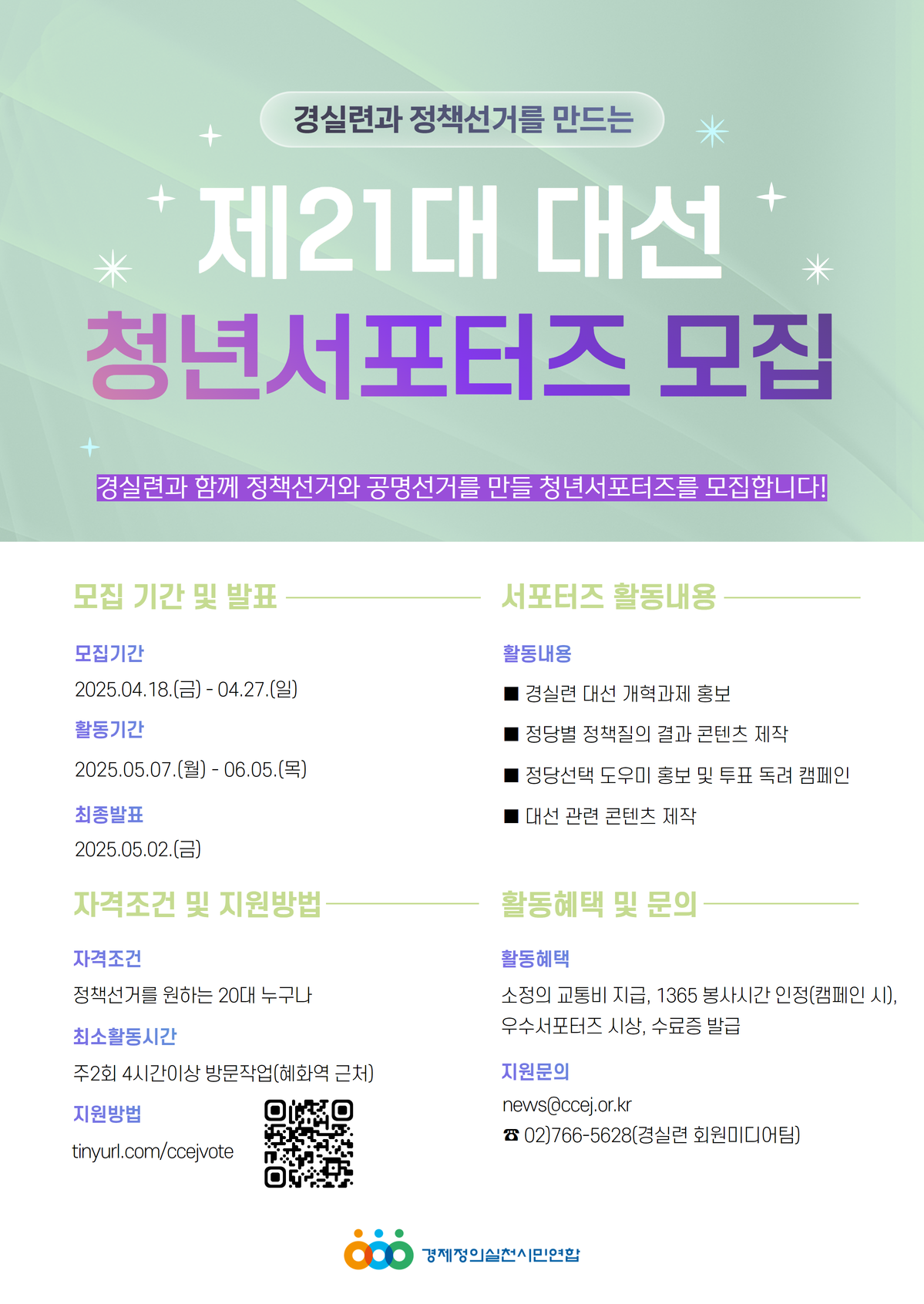경실련은 2025년 제21대 대통령 선거가 공정하게 진행될 수 있도록 감시하고 정책 선거를 홍보하는 등 콘텐츠 제작 활동을 진행할 예정입니다. 경실련과 함께 할 청년서포터즈를 모집하오니 많은 관심 부탁드립니다.