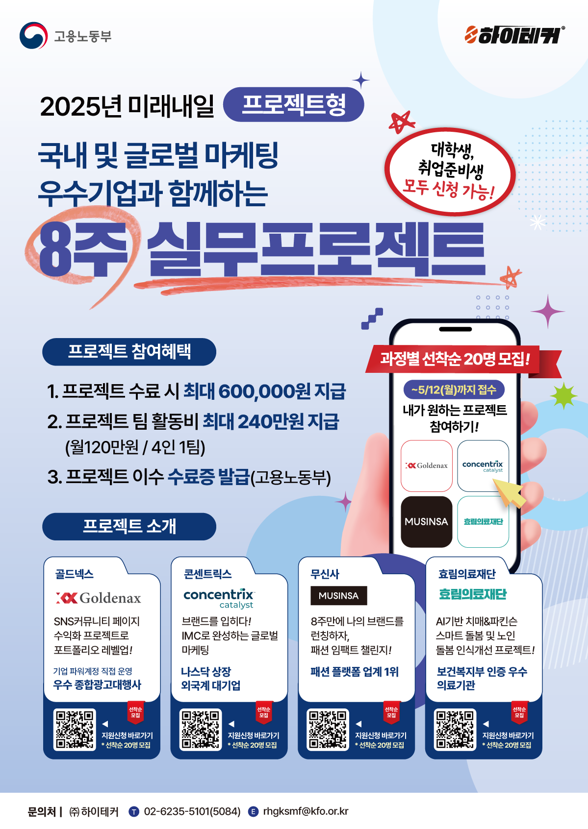 기업멘토와 함께 기업에서 부여하는 실무 프로젝트(8주)를 수행하며 직무체험 및 일경험을 통한 포트폴리오 및 취업역량 강화