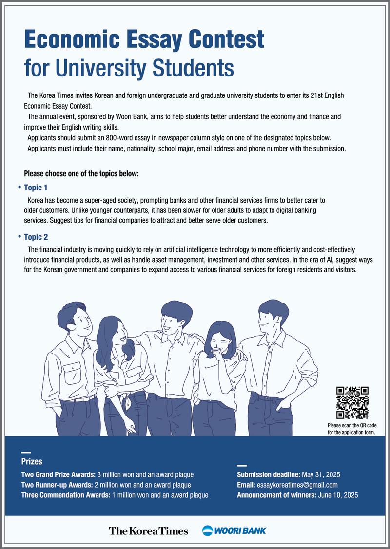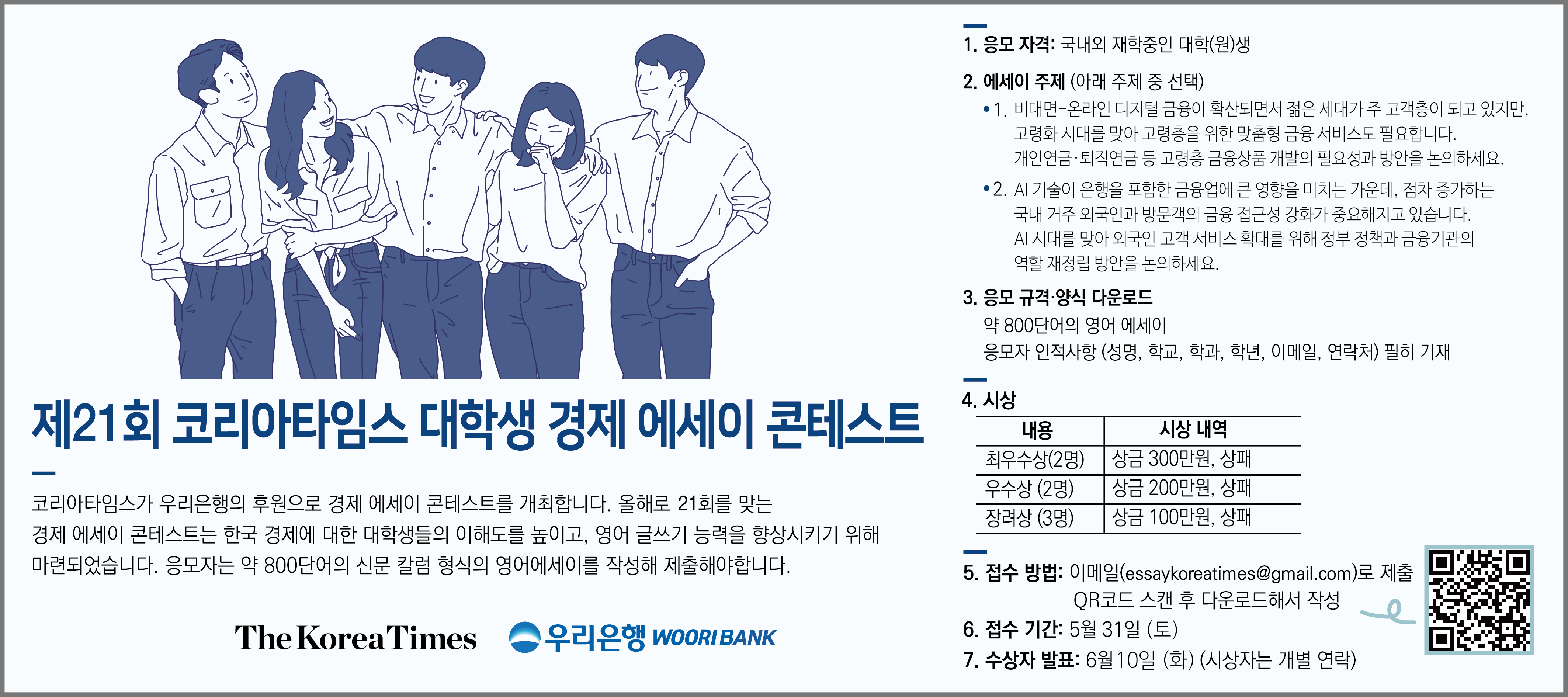 - 신청방법: 참가신청서 폼(포스터 내 QR코드 혹은 홈페이지 참조)에 에세이 작성 후 담당자 전자메일(essaykoreatimes@gmail.com)로 제출