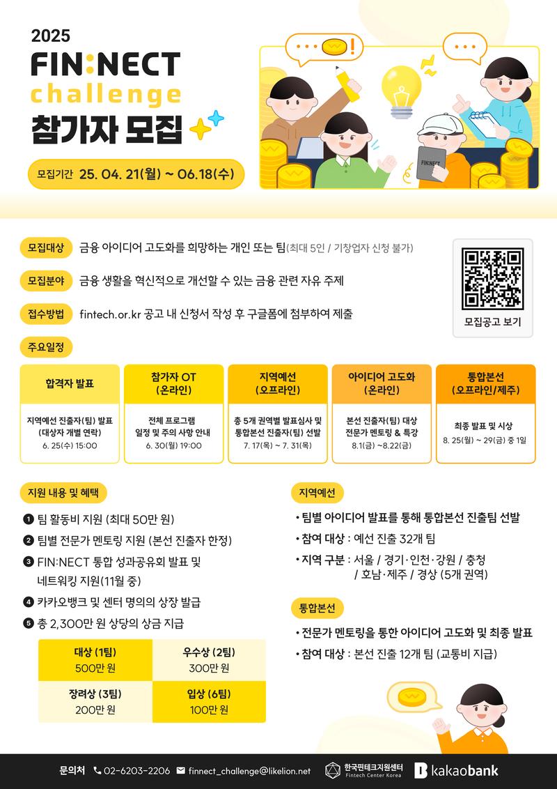 한국핀테크지원센터와 카카오뱅크에서는 지역별 일상 속 금융 문제를 개선하기 위한「FIN:NECT 챌린지」참가자 모집을 다음과 같이 공고하오니 많은 참여 바랍니다.