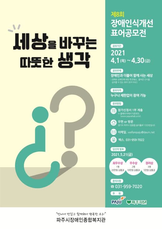 파주시장애인종합복지관은 개관 23주년 및 제41회 장애인의 날을 기념하여 '제8회 장애인식개선 표어공모전'을 진행하오니 관심 있는 분들의 많은 참여 부탁드립니다.
