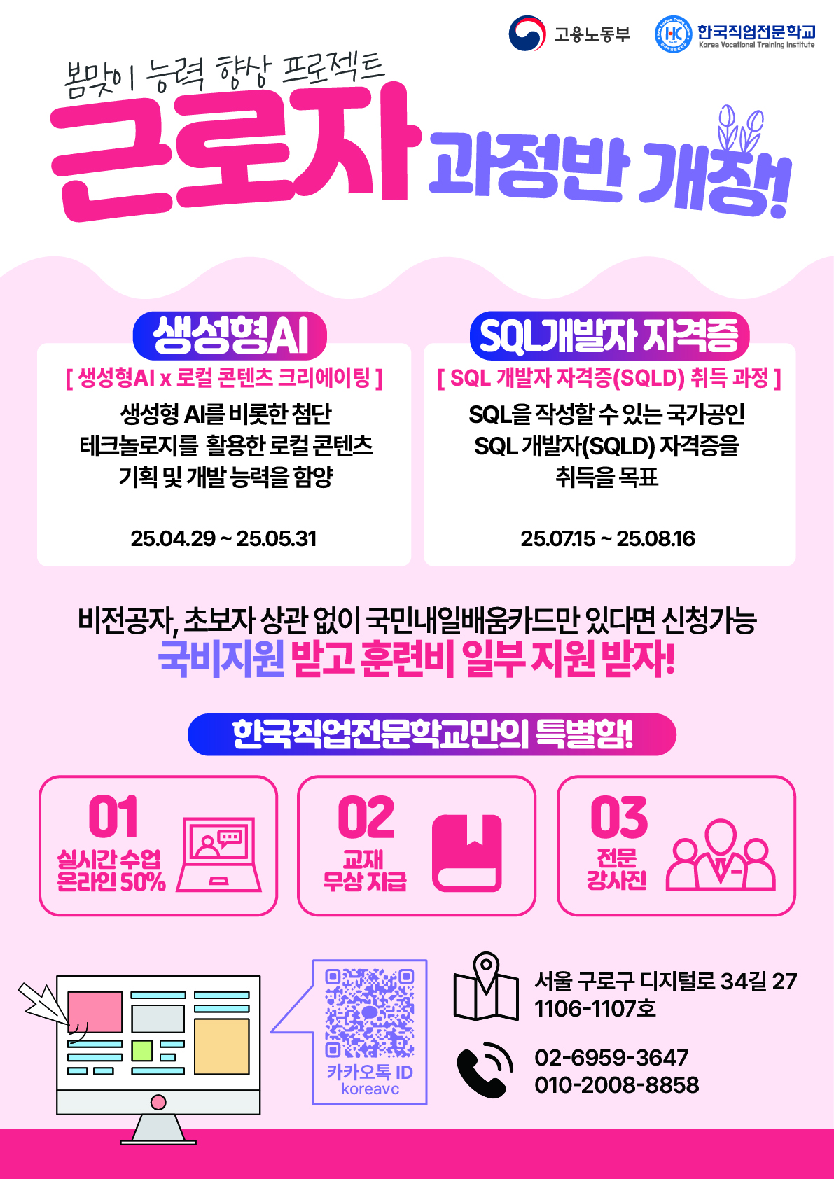 바쁜 여러분을 위해 50%의 주말 대면 교육은 서울 구로G밸리(한국직업전문학교)에서 진행합니다.