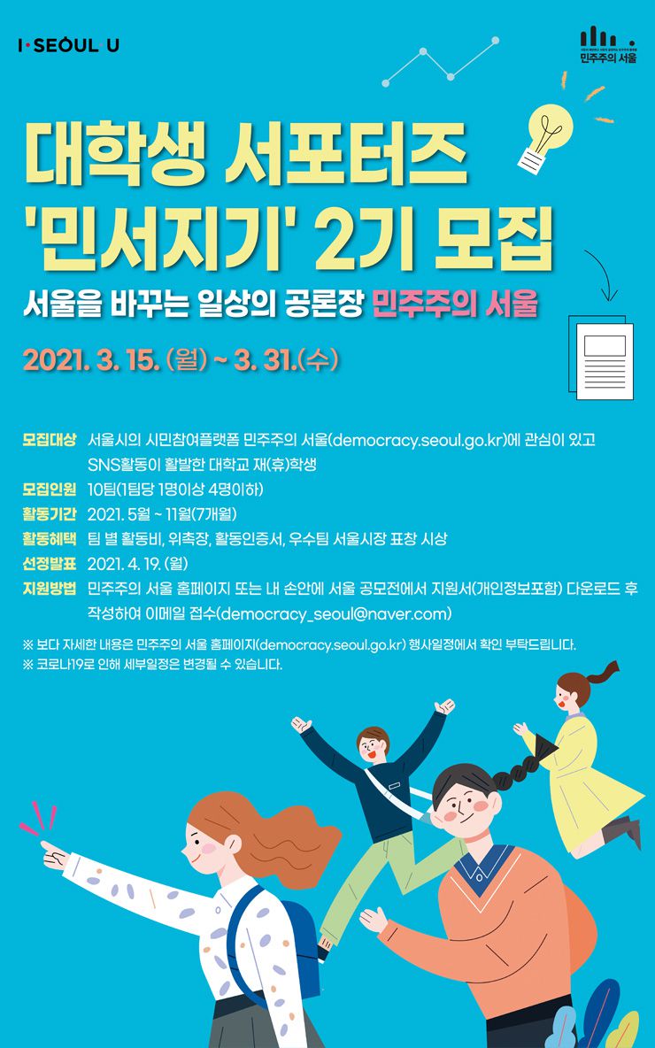 시민과 서울시가 함께 일상의 정책을 만드는 시민참여 플랫폼「민주주의 서울」대학생 온라인 서포터즈(민서지기)를 아래와 같이 모집 공고합니다.
