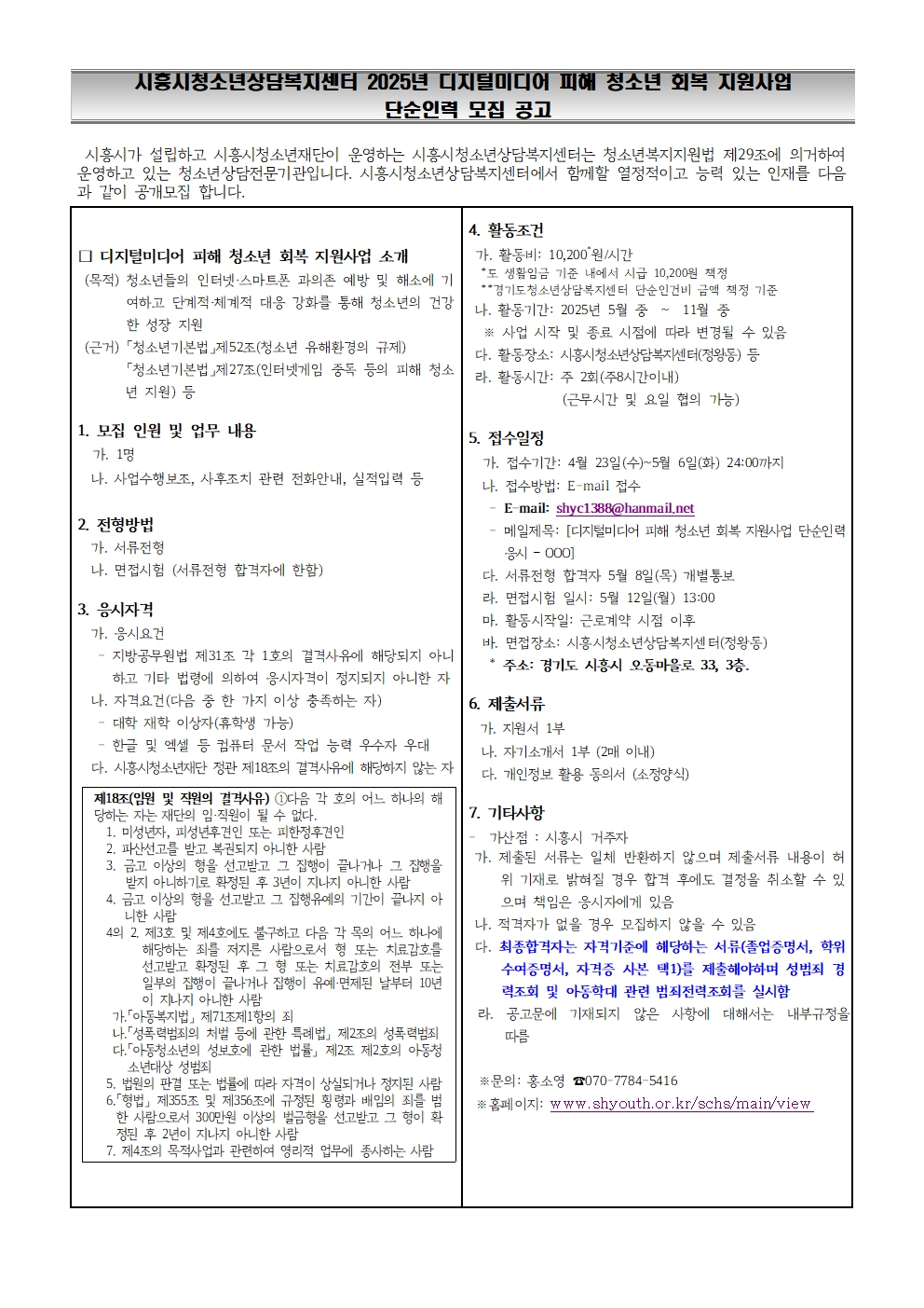 시흥시청소년상담복지센터에서는 2025년 디지털미디어 피해 청소년 회복 지원사업을 위한 단순인력을 다음과 같이 공개모집 합니다.