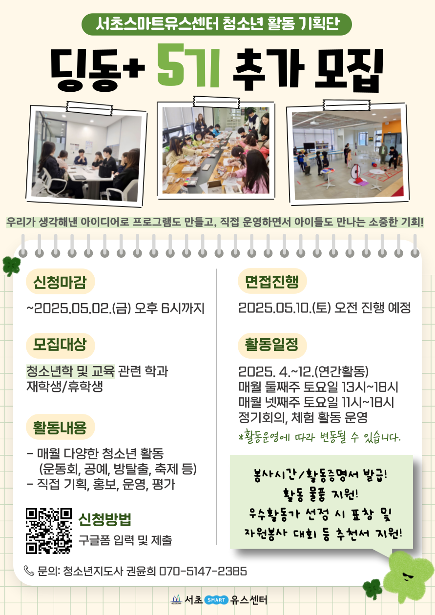 ‼️[공공기관]서초유스센터 대학생기획동아리 딩동+ 5기 추가 모집‼️