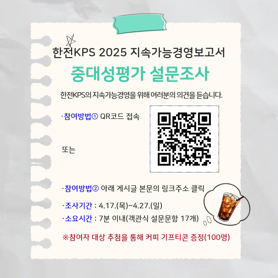 한전KPS에서는 기관의 ESG 경영 개선을 위해 국민 등 기관 이해관계자를 대상으로 설문조사를 시행중입니다. 설문조사 결과는 기관의 중요 이슈를 도출하고 평가하여 기관의 ESG 경영에 반영하기 위해 활용됩니다. 국민 여러분의 많은 참여를 바랍니다. 감사합니다.