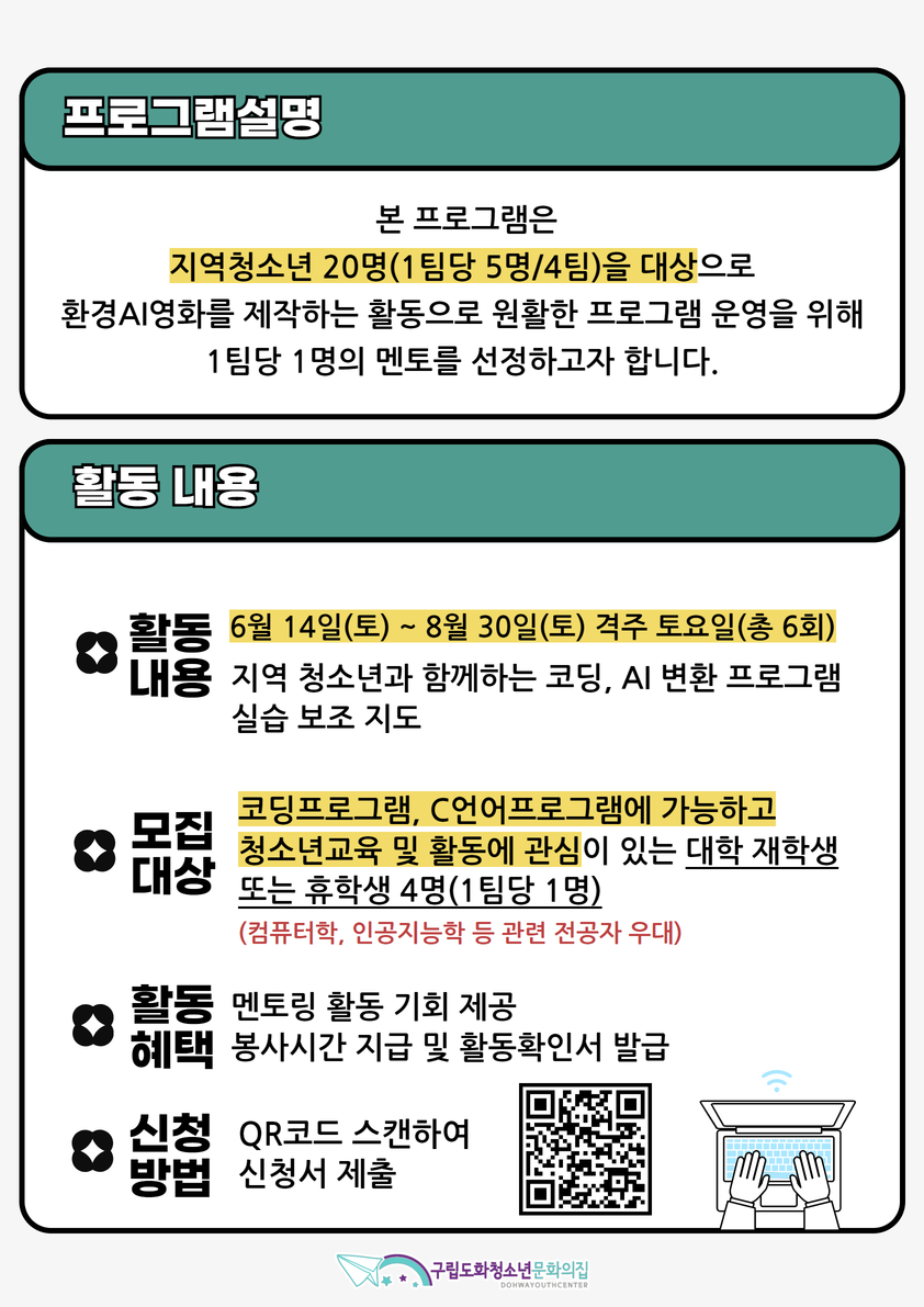 " 본 프로그램은 지역청소년 20명(1팀당 5명/4팀)을 대상으로 환경AI영화를 제작하는 활동으로 참가청소년들의 AI 기술활용과 실습이 원활하게 진행될 수 있도록 멘토 4명를 선정하고자 합니다!"