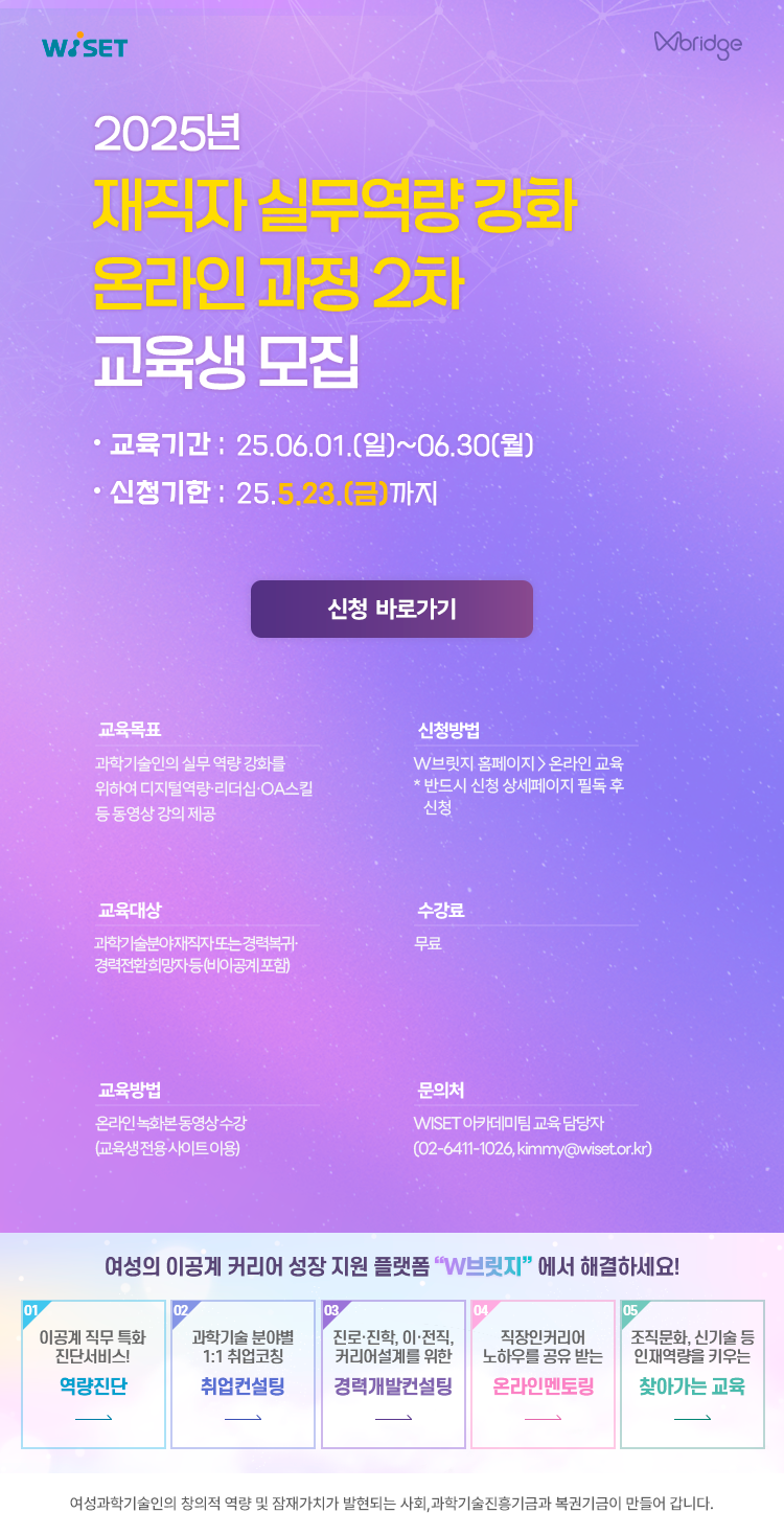 ◾ 대상: 과학기술분야 재직자로 경력복귀·경력전환 희망자 700명 내외 ※ 남녀 모두 가능, 비이공계 전공자 포함