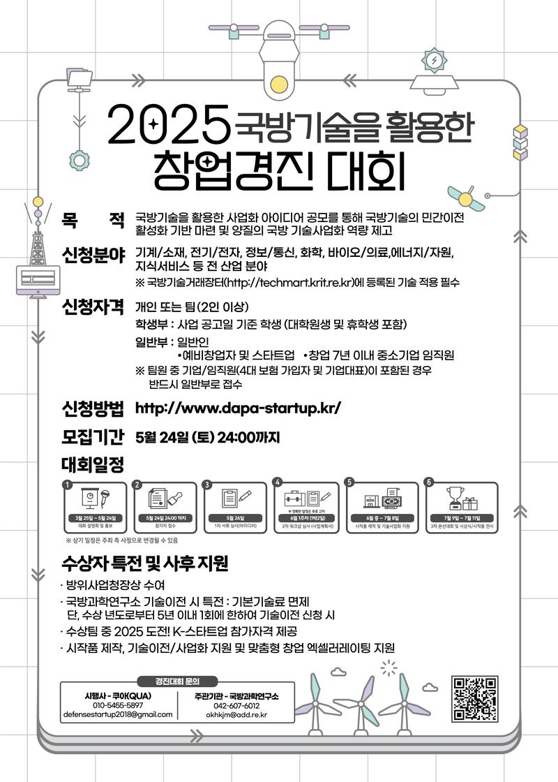 - 국방기술을 활용한 사업화 아이디어 공모를 통해 국방과학기술의 민간이전 활성화 기반 마련 및 국내 창업분위기 조성