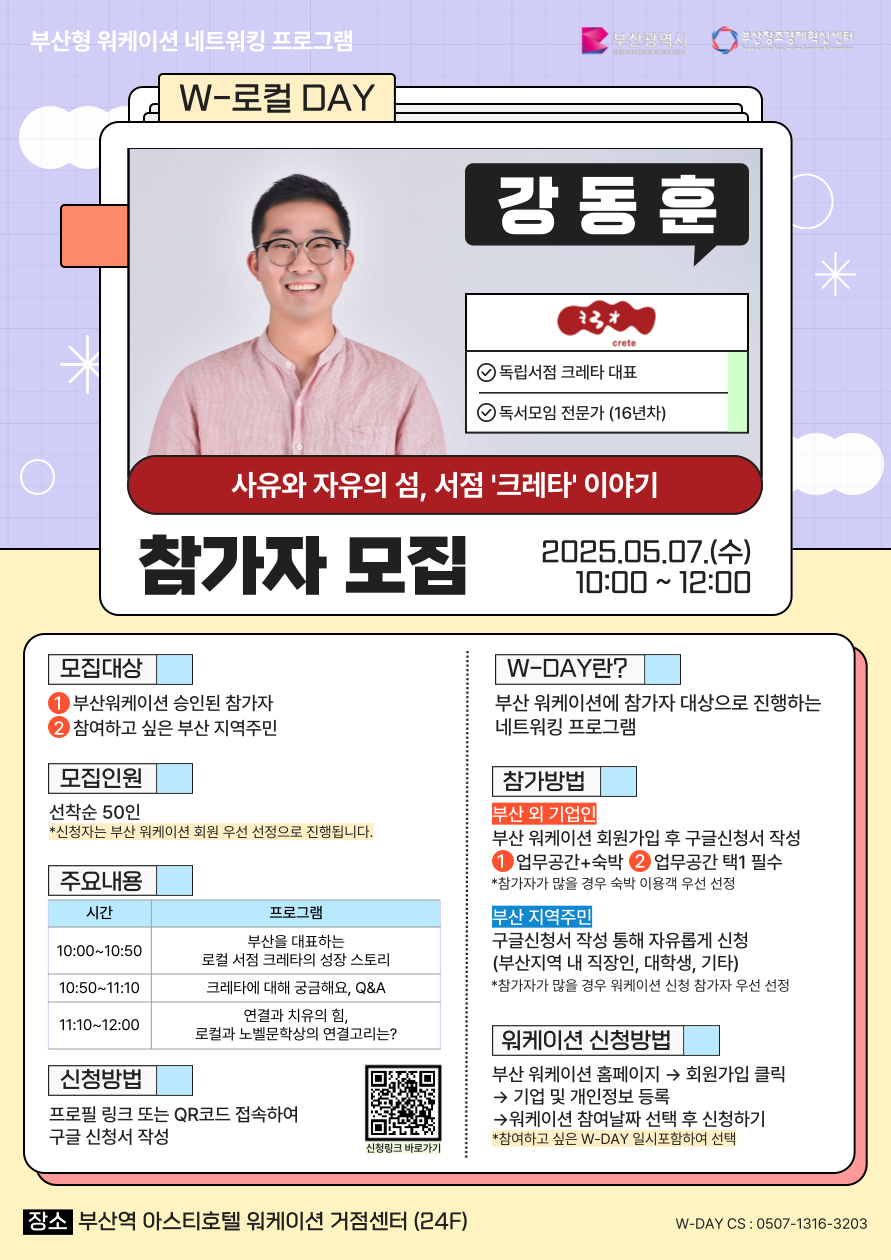 부산 전포동, 사유와 자유의 감성이 가득한 공간 ‘크레타’의 이야기를 직접 들을 수 있는 시간이 찾아옵니다! 이번 강연에서는 단순한 책방이 아닌, 부산을 대표하는 로컬 서점으로 성장해온 크레타의 여정을 들려드립니다. 책을 사랑하는 이들의 아지트로 시작해, 한강 작가 신드롬과 같은 문학적 흐름을 지역과 연결하는 플랫폼으로 확장되기까지—크레타는 어떻게 ‘로컬’과 ‘세계 문학’을 잇는 교두보가 되었을까요? 책과 사람, 그리고 도시를 연결하는 이야기가 궁금하다면, 이번 강연을 놓치지 마세요. 그리고 특별 증정 이벤트도 준비되어 있습니다. 노벨문학상 수상 작가 한강의 신간 도서와, 오직 크레타에서만 만날 수 있는 전용 굿즈가 추첨을 통해 현장에서 증정됩니다!