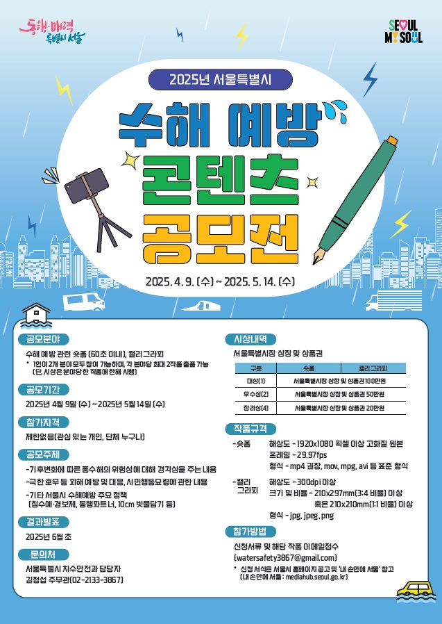 서울특별시 공고 제2025-1208호(2025.4.9.)로 공고한 ‘2025년 서울시 수해 예방 콘텐츠 공모전’ 공고 내용 중 접수처 착오 기재사항이 확인되어 다음과 같이 정정공고 합니다.