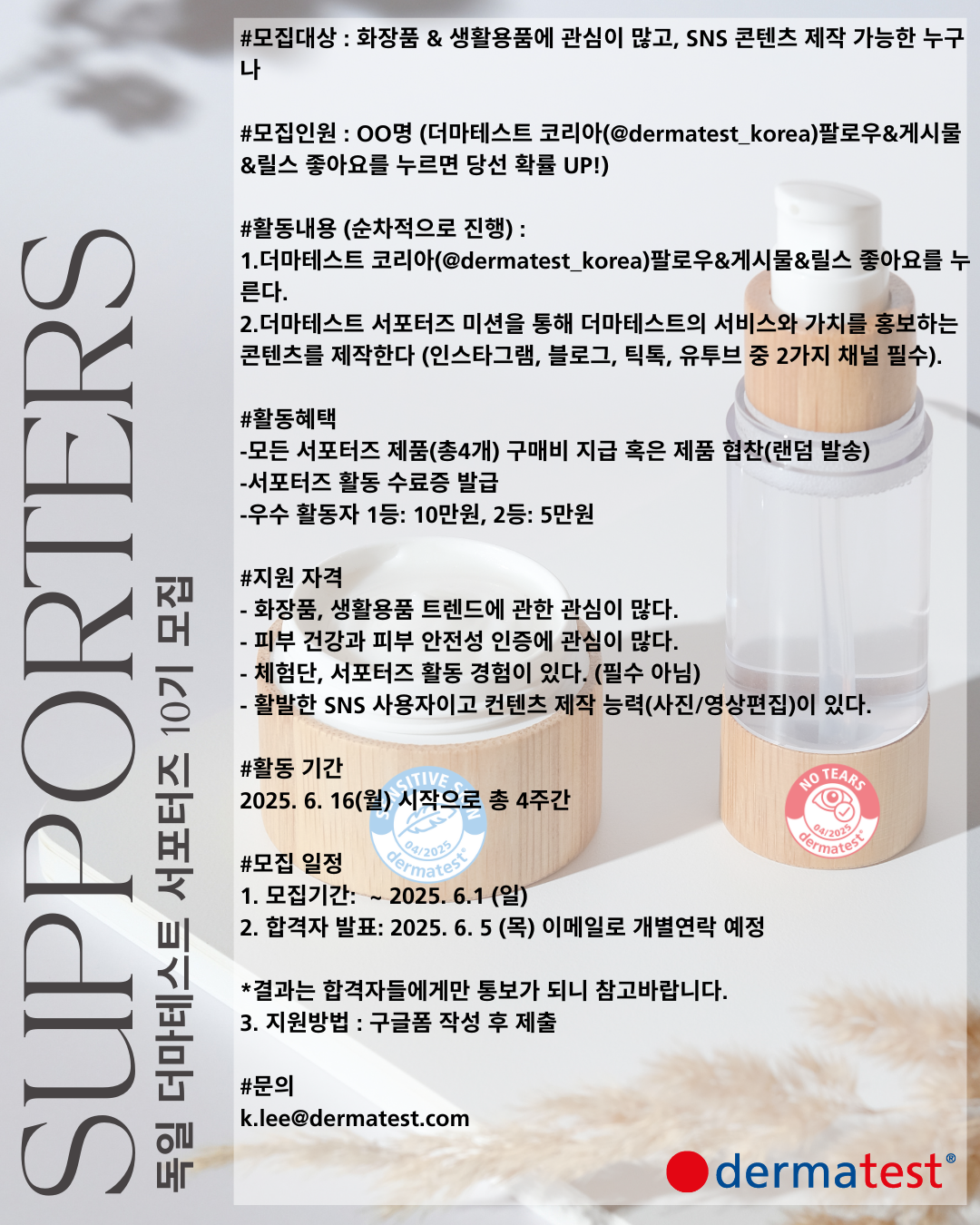 더마테스트는 K-뷰티가 안전하고 피부 친화적인 제품으로 더 잘 알려지고 새로운 미의 기준을 세우는데 기여하고자 합니다. 더마테스트의 가치와 서비스를 널리 알리는 서포터즈가 되어주세요! 🙂
