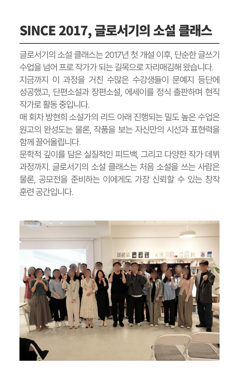 소설 작법 클래스(기초반 4주 과정) : 방현희 소설가에게 4주 동안 소설 창작의 기초 이론을 배우고, 매 회차 실습을 통해 단편 소설 한 편을 완성하는 것을 목표로 합니다. 본 소설 클래스는 2017년 첫 개강 이후로, 지금까지도 지속적인 커리큘럼의 업데이트가 이루어지고 있습니다. 특히, 전업 강사가 아닌, 매년 작품을 출간하는 현역 소설가에게 소설을 배울 수 있는 곳은 드뭅니다.
