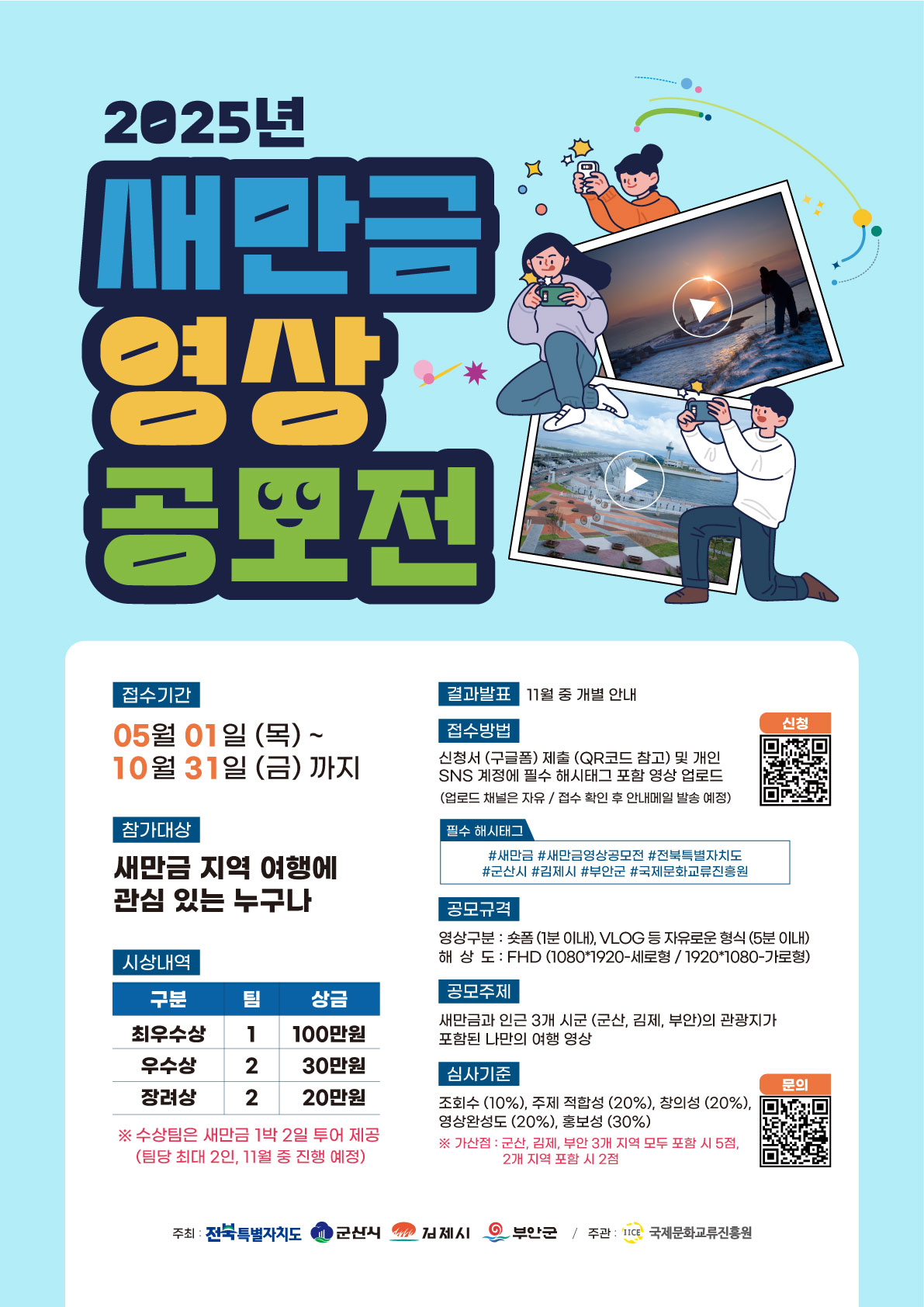 ○ 필수해시태그 : #새만금 #새만금영상공모전 #전북특별자치도 #군산시 #김제시 #부안군 #국제문화교류진흥원