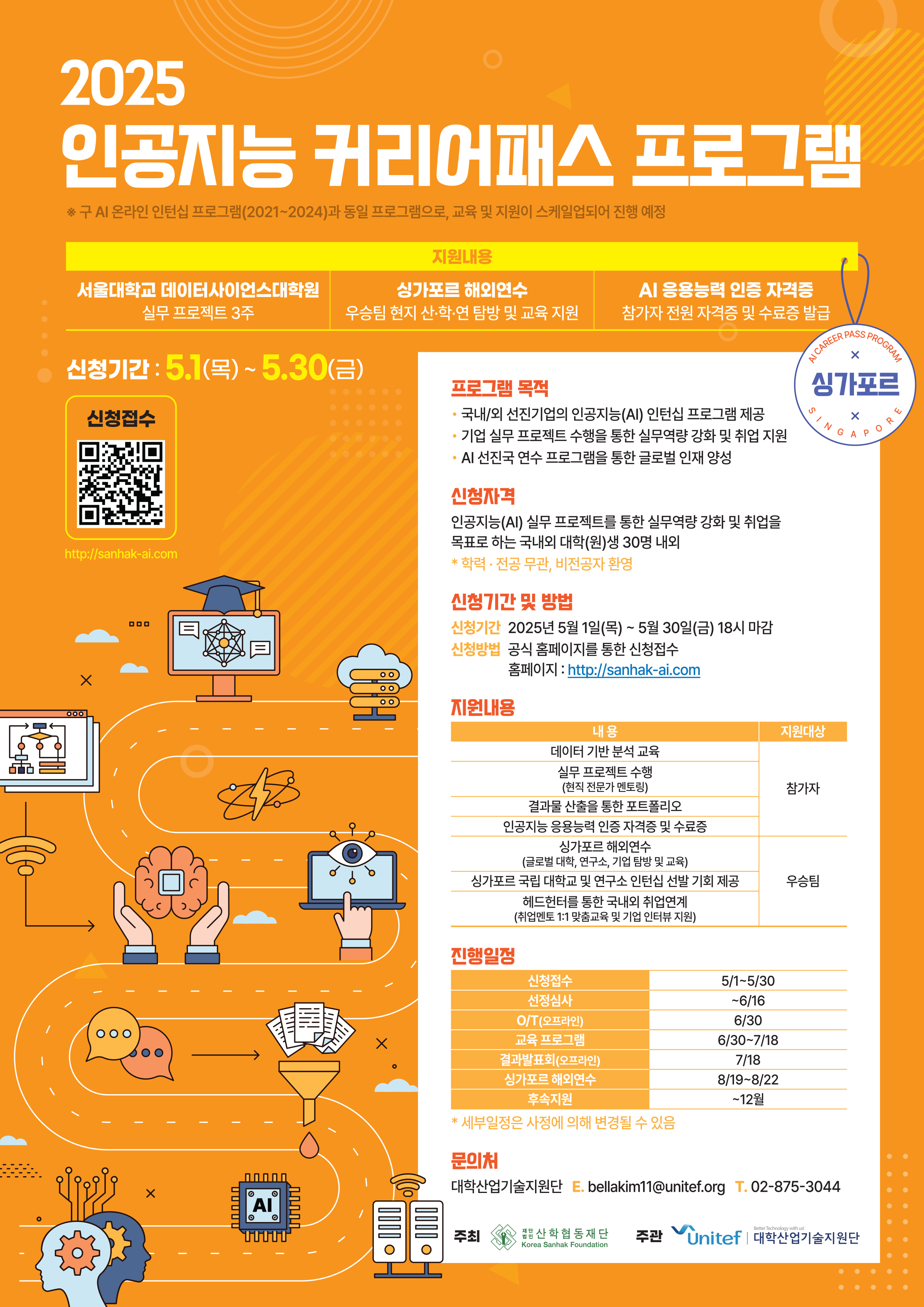산학재단이 주최하고, 유니테프가 주관하는 '2025 인공지능 커리어패스 프로그램'을 다음과 같이 공고하오니, 참여하고자 하는 국내 대학생, 대학원생, 박사후연구원은 공고문에 따라 신청하시기 바랍니다.