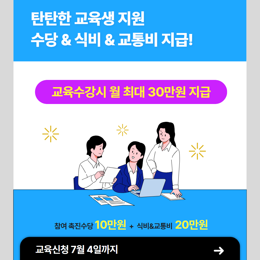 교육 수강시 월 최대 30만원 지급( 참여촉진수당 10만원 + 식비&교통비 20만원)