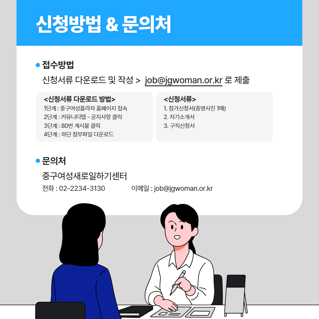 4. 신청서류 및 증명사진 1매 첨부하여 job@jgwoman.or.kr로 이메일 접수