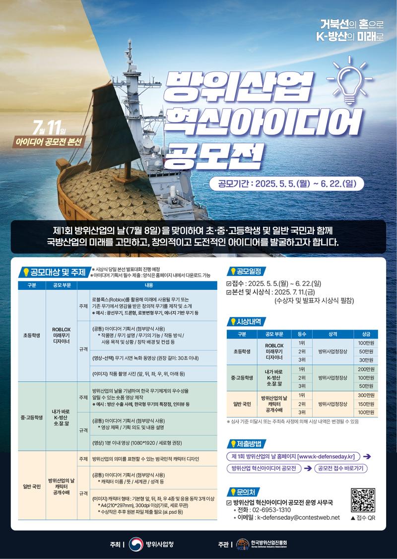 ■ 공모 일정 ▪접수 기간 : 2025. 5. 5.(월) ~ 6. 22.(일) ▪본선 및 시상식 : 2025. 7. 11.(금) (수상자 및 발표자 시상식 필참) ■ 제출 방법 ▪ 제1회 방위사업의날 홈페이지 [www.k-defenseday.k→[방위사업혁신 아이디어 공모전] → [공모전 접수 바로가기] ■ 문의처 ▪방위산업 혁신아이디어 공모전 운영 사무국 ▪전화 : 02-6953-1310 ▪이메일 : k-defenseday@contestweb.net |