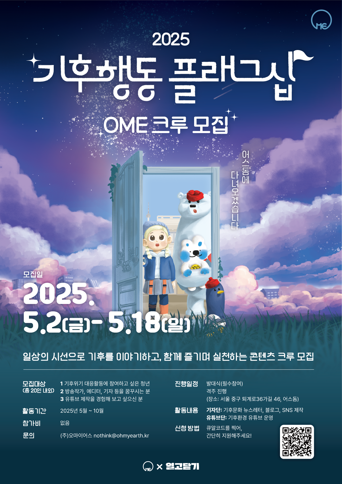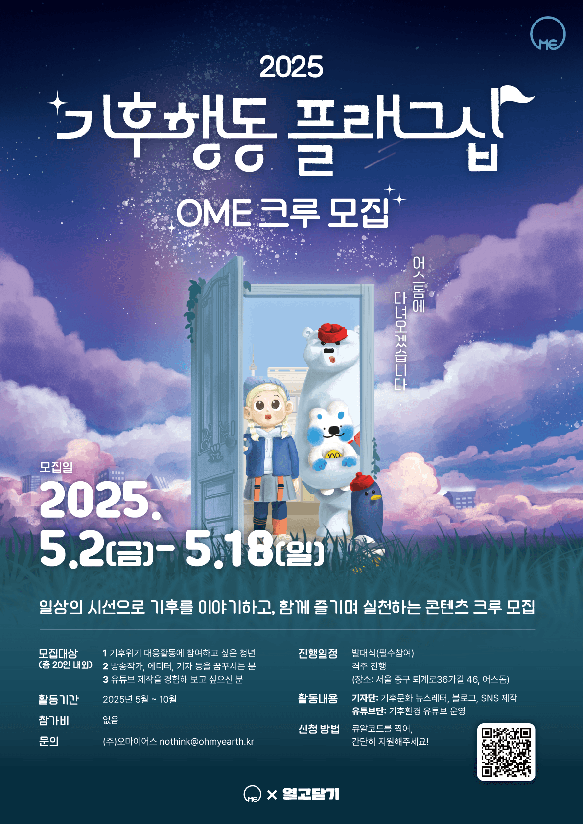 OME는 기후에 진심인 청년들이 모여 기획, 디자인, 영상, 기사, 콘텐츠까지 직접 만드는 실행 중심의 크루 활동입니다.