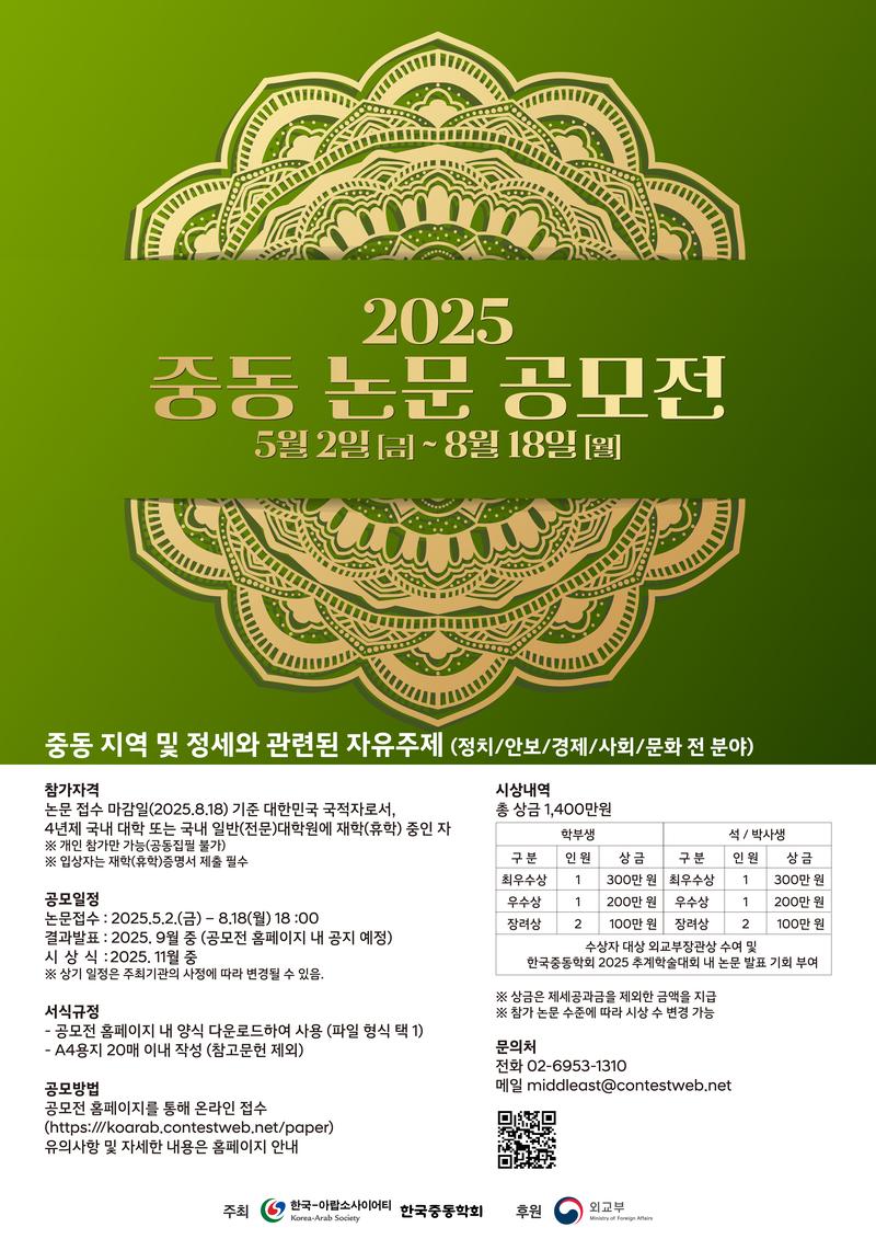 수상자 대상 외교부장관상 수여 및 한국중동학회 2025 추계학술대회 내 논문 발표 기회 부여 ※ 상금은 제세공과금을 제외한 금액을 지급 ※ 적격 논문이 없을 시 포상하지 않을 수 있으며, 참가 논문 수준에 따라 시상자 수 변경 가능 □ 문의 : 월~금 09:30 ~ 18:30 (주말 및 공휴일 제외) 전화 02-6953-1310 □ 기타 유의사항 : (1) 국내외 단체(기관, 기업 등) 공모전 및 사업에 제출하였거나 학술지(논문집) 등 다른 간행물에 게재된 논문은 응모 불가 (2) 응모자는 [개인정보 수집・이용 동의서 / 저작권 및 응모자격 요건 확인서]에 동의해야 참가가 가능하며, 논문 내용에 대한 표절 시비 및 기타 저작권법 위반 여부에 대한 책임은 응모자에게 있음 (3) 저서, 논문 등을 인용할 때는 반드시 정확한 출처를 명기해야 하며, 논문 시상 이후라도 표절, 도용 등이 밝혀질 경우에는 해당 학교 및 학과에 동 내용을 통보하고 입상 취소 및 상금회수 조치함 (4) 응모한 논문은 심사기간 동안 ‘2025 중동 논문 공모전’ 외 다른 용도로 사용할 수 없음 (5) 응모 논문의 저작권은 응모자에게 귀속됨 (6) 입상작은 공고된 상금이나 부상을 지급함으로써 정당한 대가를 지급하는 것으로 간주하며, 주최기관은 수상작에 대한 저작재산권, 복제권, 전시권, 배포권, 2차적 저작물작성권 등을 이용할 권리를 가짐 (7) 개인별 논문 작성 요망(그룹 또는 팀으로 공동집필 불가) (8) 심사 기준에 맞는 응모작이 없을 경우, 시상 내역이 변경될 수 있음 (9) 공모전 일정 및 세부사항 등은 주최기관 사정에 따라 변경될 수 있음 (10) 심사 점수는 비공개로 하며, 심사결과에 대한 이의 신청은 받지 않음 (11) 수상작을 타 학회지 등에 게재할 경우 다음과 같은 표기를 해야하며, 게재 사실을 주관기관에 고지하여야 함