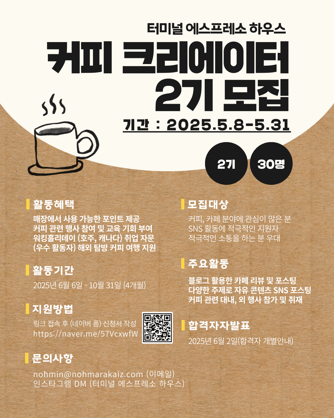 - 문의: nohmin@nohmarakaiz.com (이메일) 또는 인스타그램 DM (@terminalespressohouse)