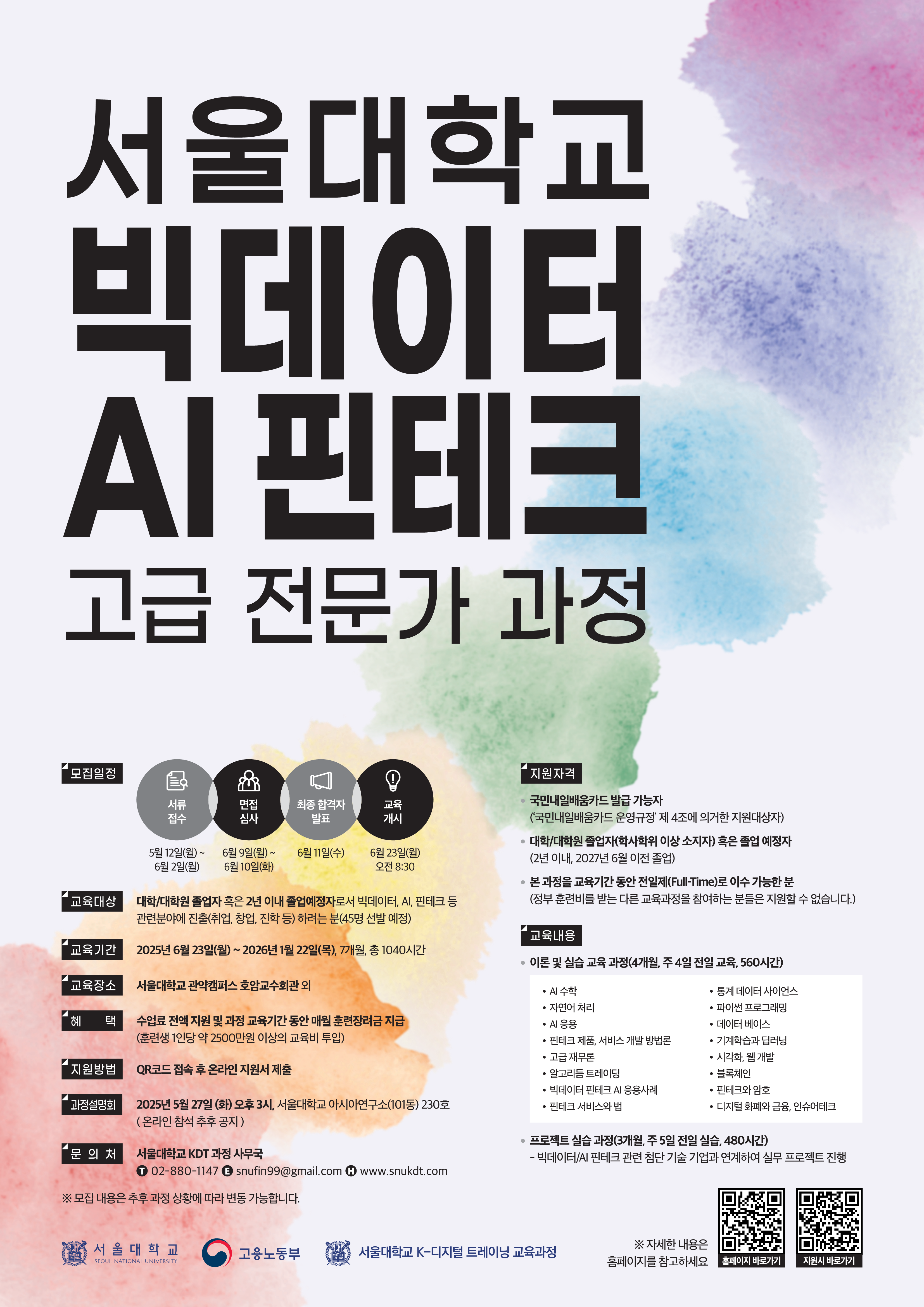 본 교육 과정은 서울대학교가 주관하는 빅데이터 핀테크 AI 고급 전문가 양성 과정이자 고용노동부의 KDT사업으로 수업료 전액 지원되는 국비교육과정에 해당하며,