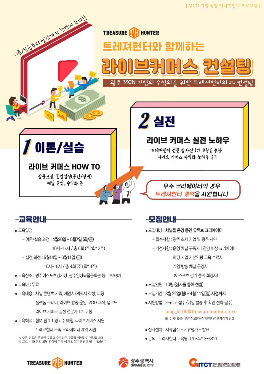 광주정보문화산업진흥원과 대형 MCN 기업 트레져헌터가 공동으로 광주 지역 유망 유튜브 크리에이터의 수익화를 위한 라이브커머스 무료 컨설팅 교육을 실시합니다.