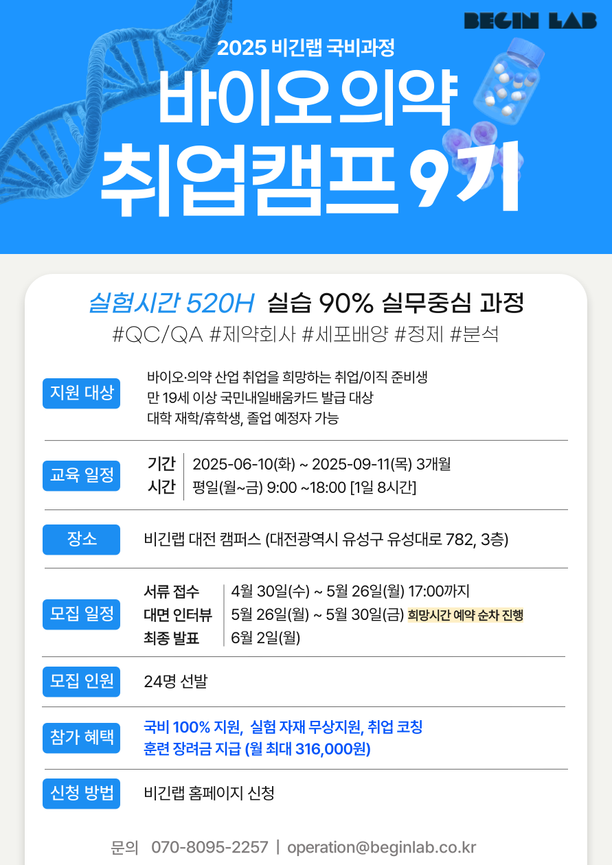 [비긴랩] 국비 바이오의약 취업캠프 9기 모집