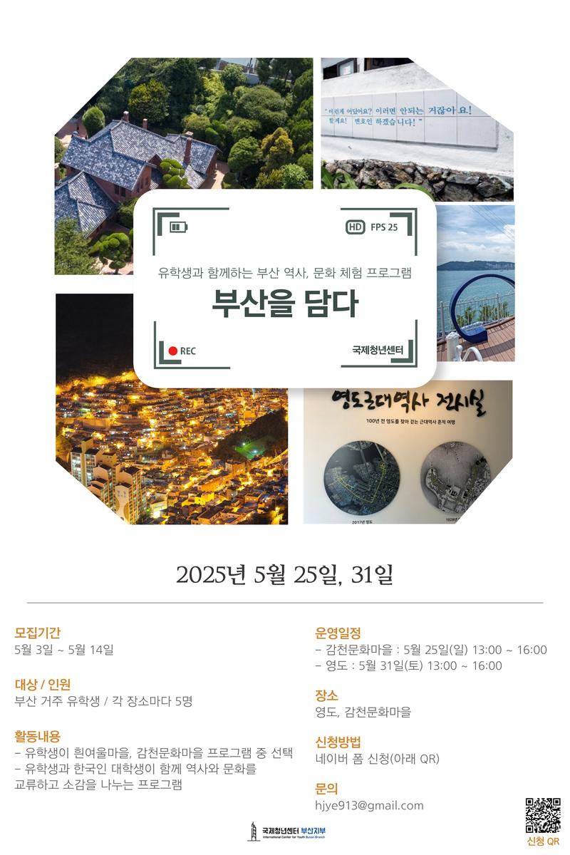 외국인 유학생들이 부산의 대표적인 역사, 문화 공간을 직접 체험하며 지역 사회에 대한 이해를 높이기 위한 프로그램으로, 흰여울문화마을, 감천문화마을 등을 탐방하며 부산 고유의 역사와 예술적 감성을 몸소 느낄 수 있습니다.