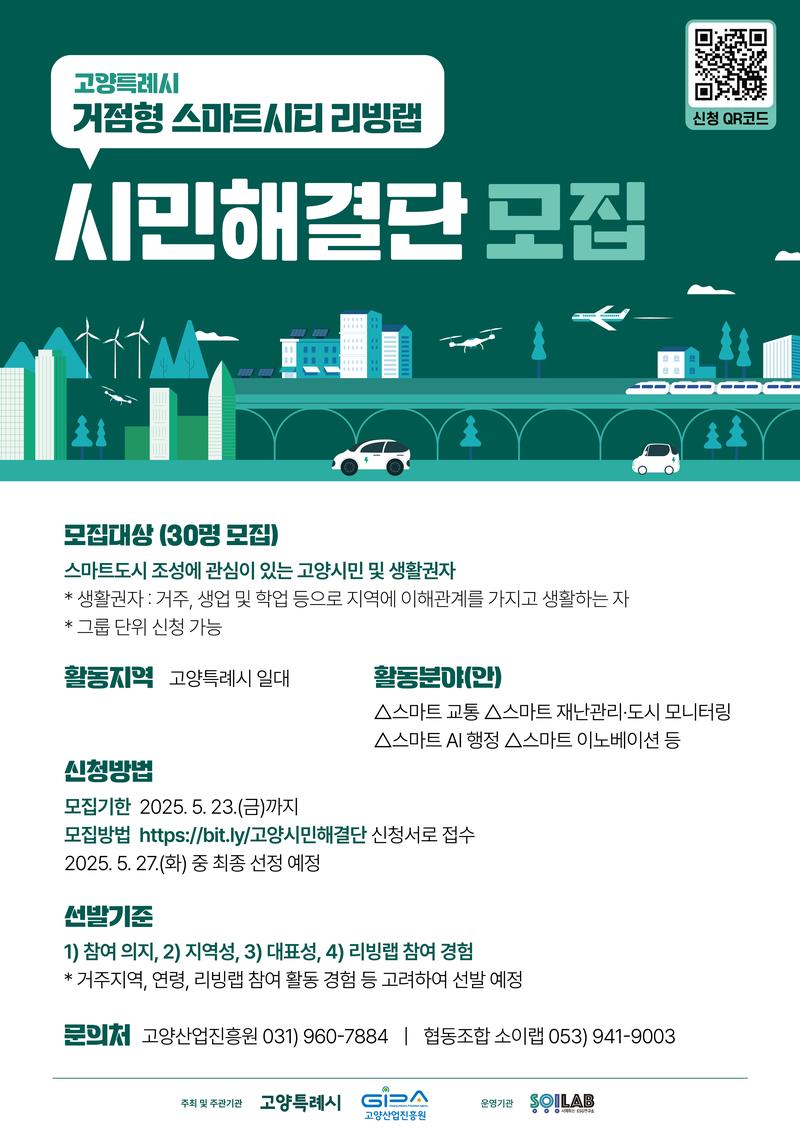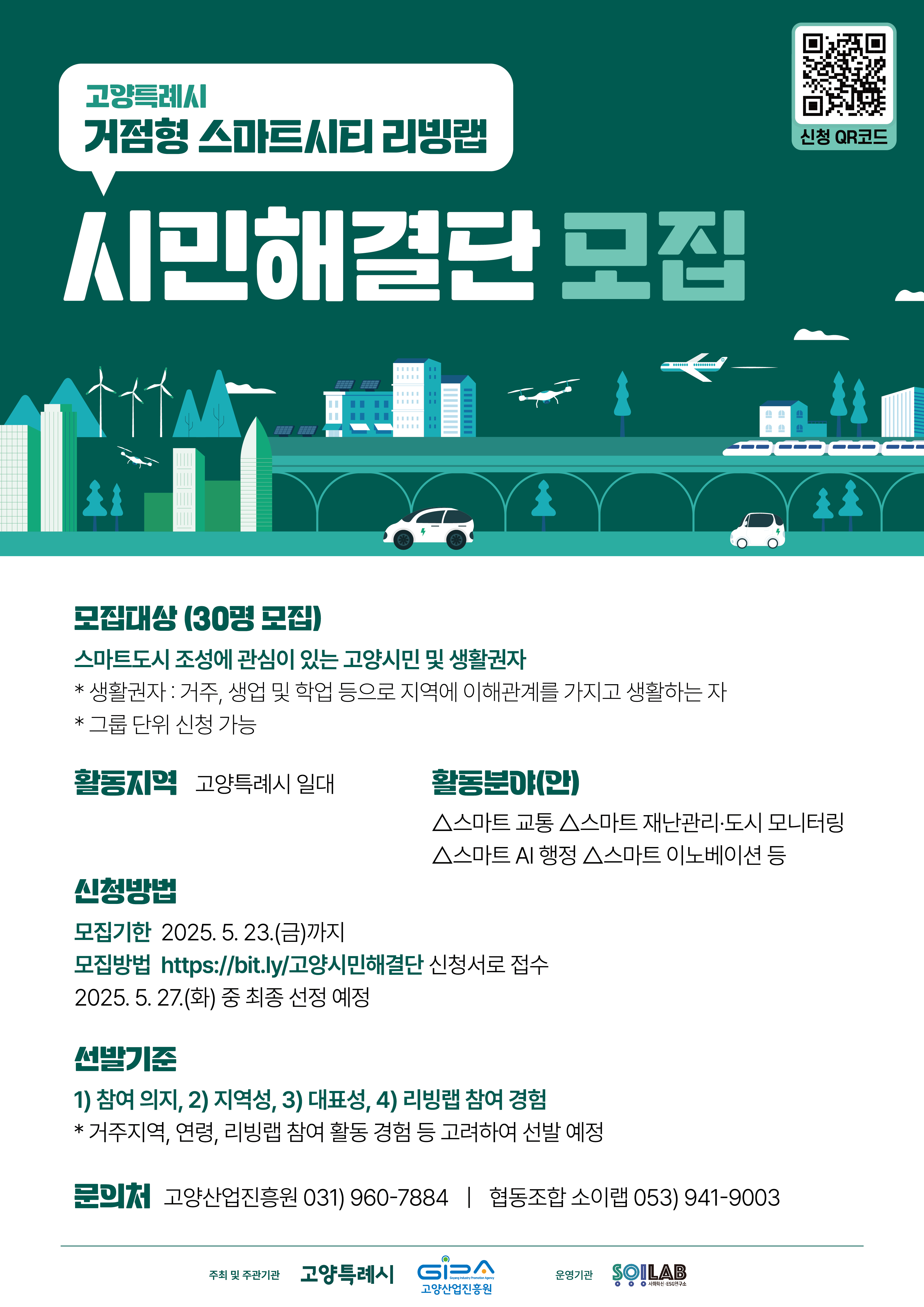 고양산업진흥원에서는『거점형 스마트시티 조성사업 거버넌스 운영』사업의 일환으로 리빙랩 ‘시민해결단’을 구성·운영하고자 합니다. 스마트교통·도시모니터링·스마트 정·공간·홍보 등 생활 현장을 함께 탐구하고, ICT-기반 솔루션을 시민들의 의견을 반영하여 직접 실증하고자 하오니 관심 있는 시민 여러분의 많은 참여 바랍니다.