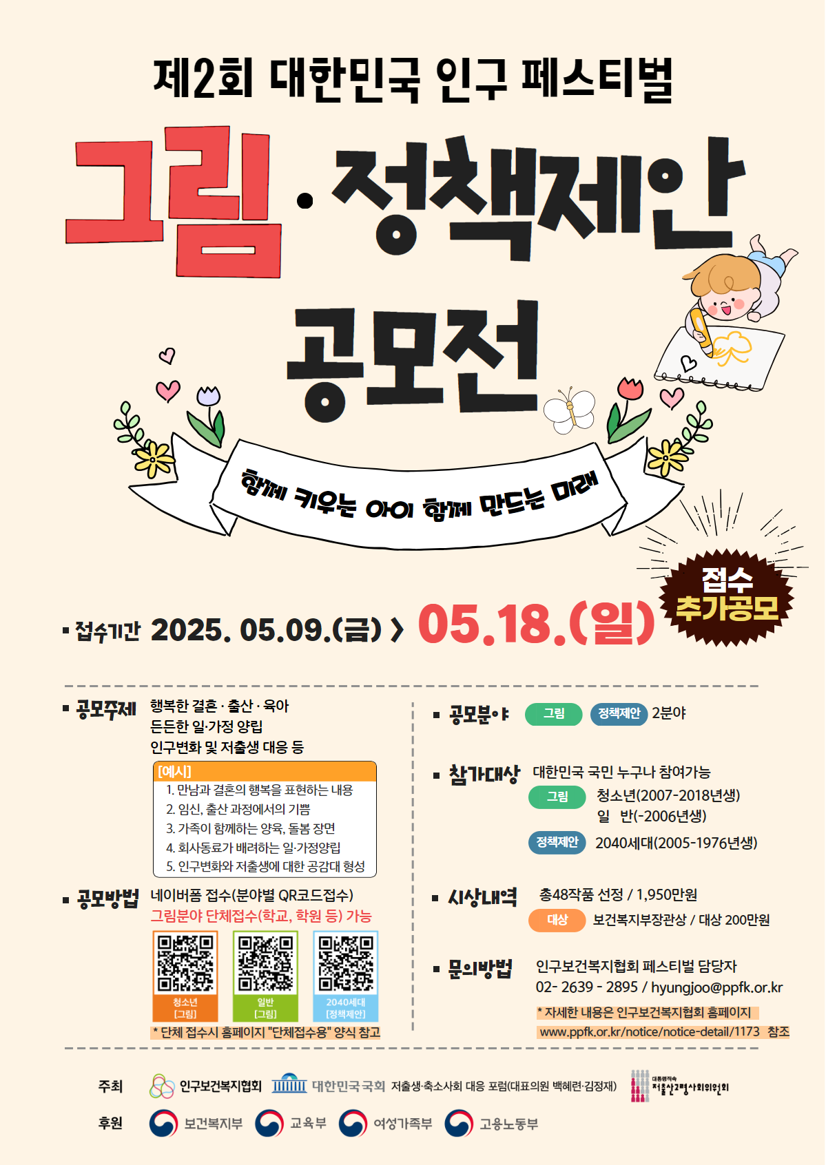 인구보건복지협회는 인구의 날을 기념하여 국민 모두가 일상 속에서 대한민국 인구현상에 대해 함께 생각하는 기회를 마련하고자 <제2회 대한민국 인구 페스티벌(2025) 그림·정책제안 공모전을 진행합니다.