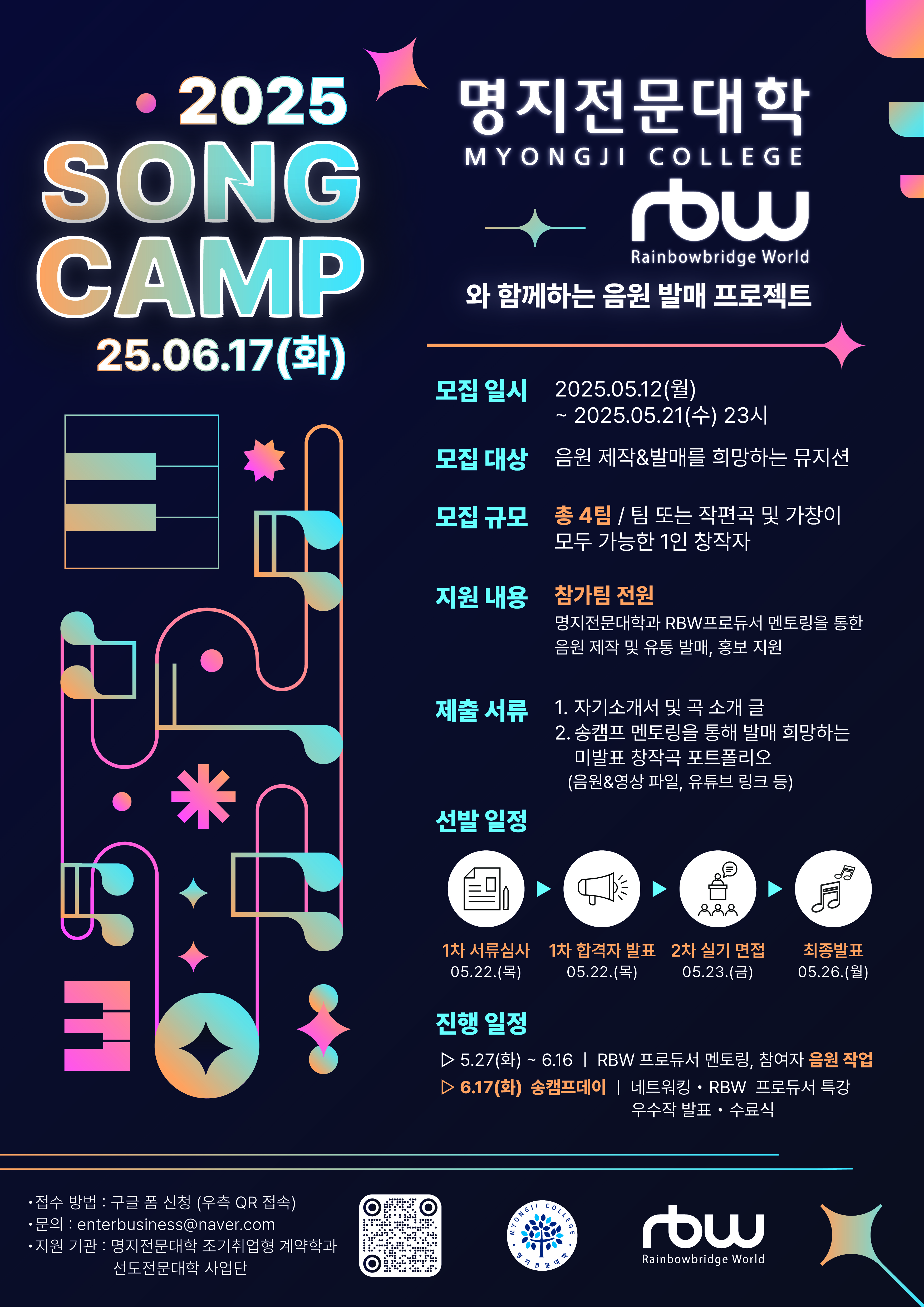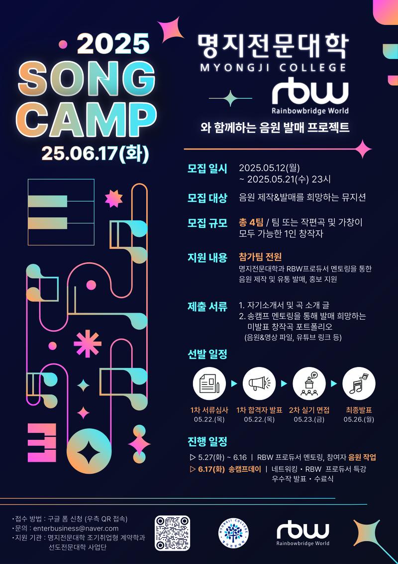 [명지전문대학 X RBW] 명지전문대학, RBW 프로듀서와 함께하는 2025 송캠프와 함께할 뮤지션을 모집합니다!🎵 (~25.05.21 수요일 23시까지!)