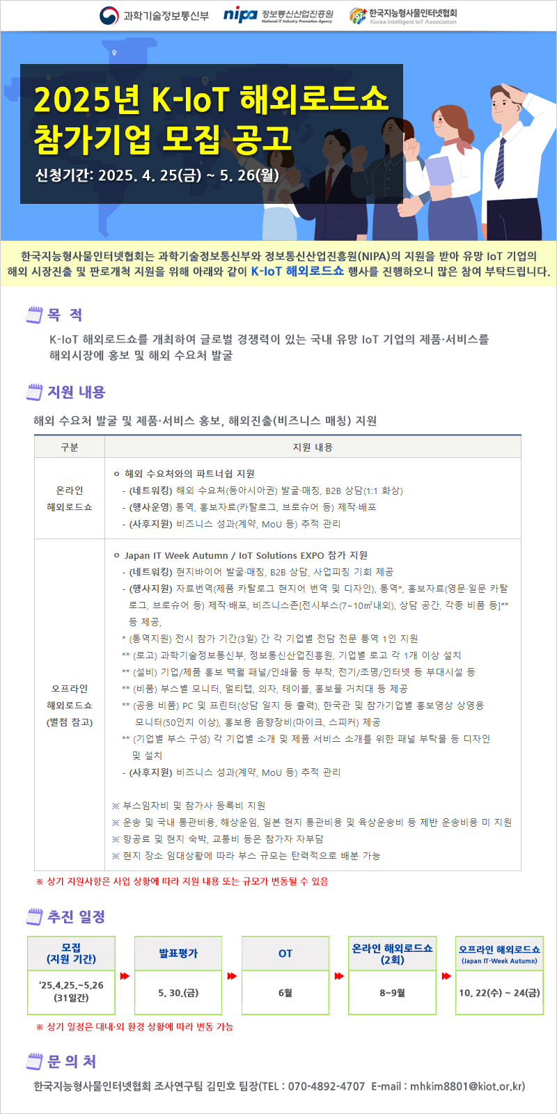 한국지능형사물인터넷협회는 과학기술정보통신부와 정보통신산업진흥원(NIPA)의 지원 받아 유망 IoT 기업의 해외 시장진출 및 판로개척 지원을 위해 아래와 같이 K-IoT 해외로드쇼 행사를 진행하오니 많은 참여 바랍니다.