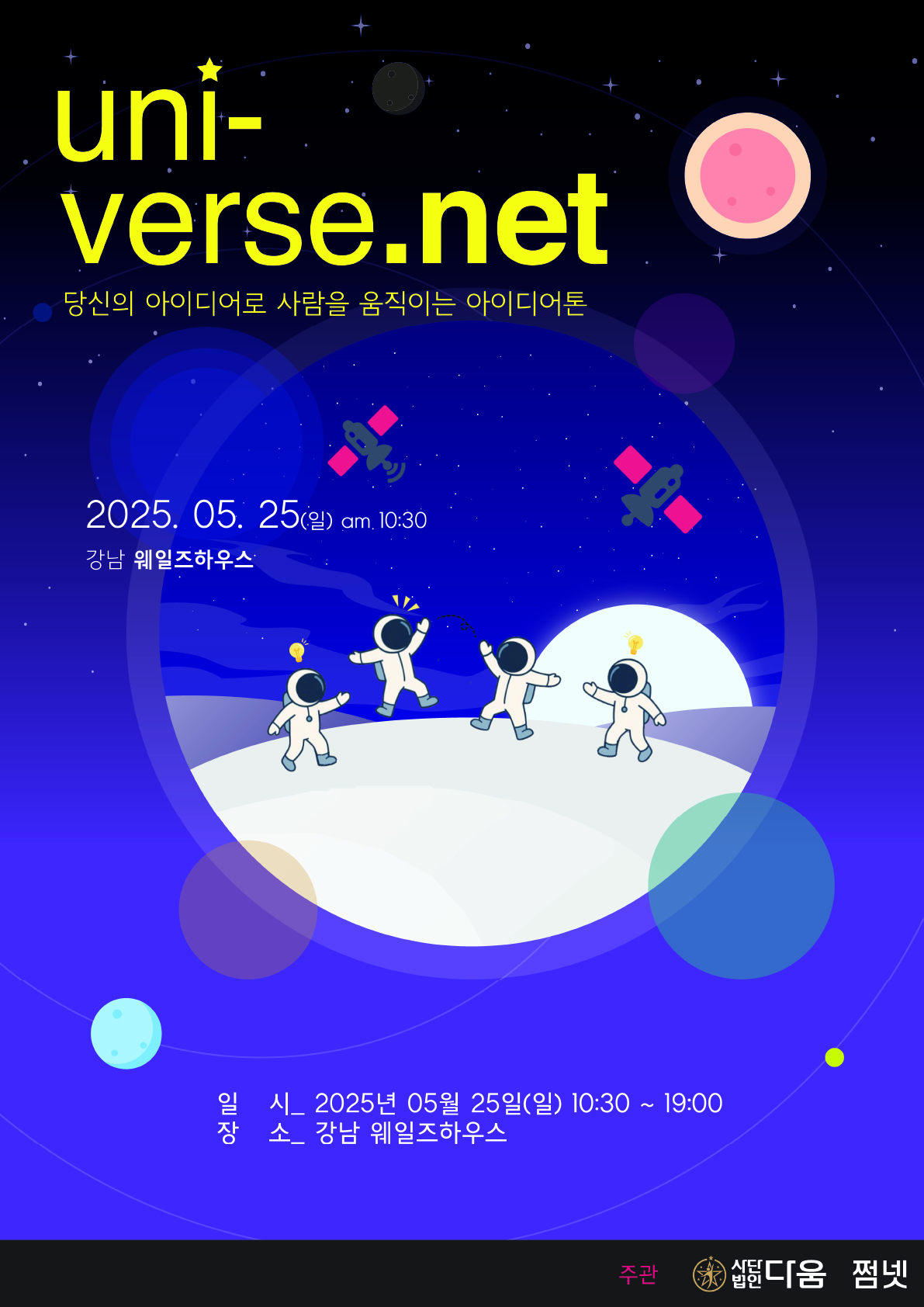 uni-verse.net은 참가자들이 1분 피치를 통해 아이디어를 발표하고, 그 아이디어로 팀을 결성하여 3분 피치를 진행합니다.