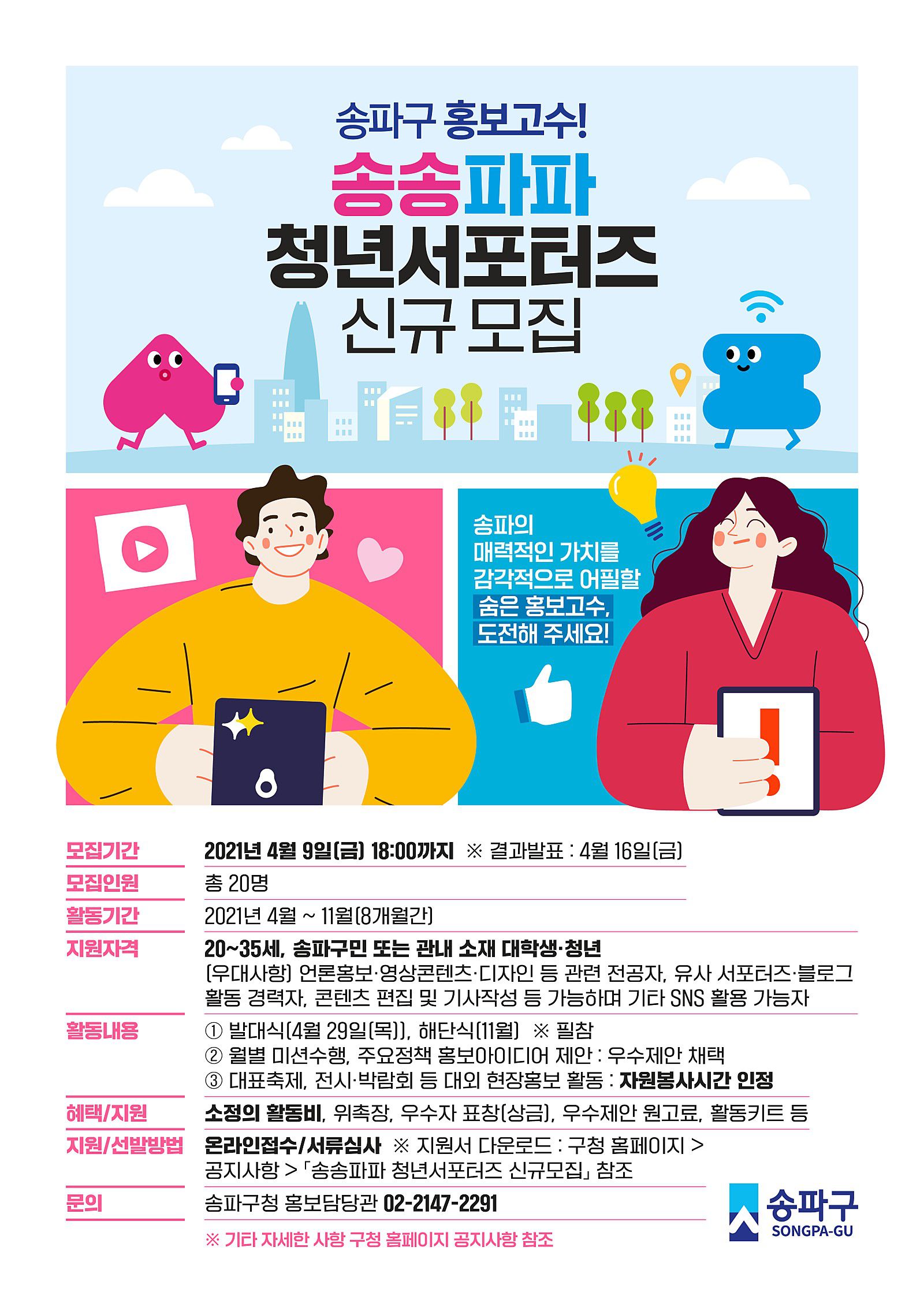 ▶지원하는 방법 : 이메일 지원(newkh@songpa.go.kr) *지원서: 구청 홈페이지 공지사항에서 다운로드