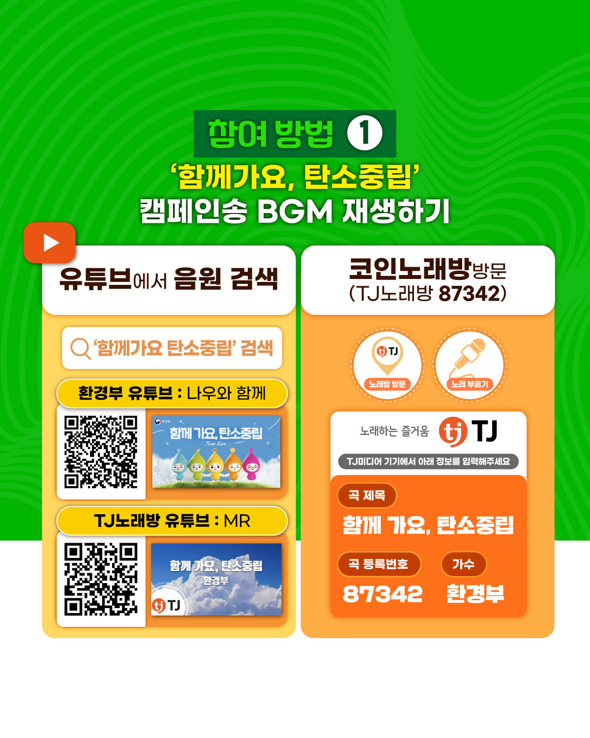 (유튜브에서 ’함께가요, 탄소중립‘ 캠페인송 음원을 사용하거나 코인노래방(TJ 노래방 곡번호:87342) 방문)