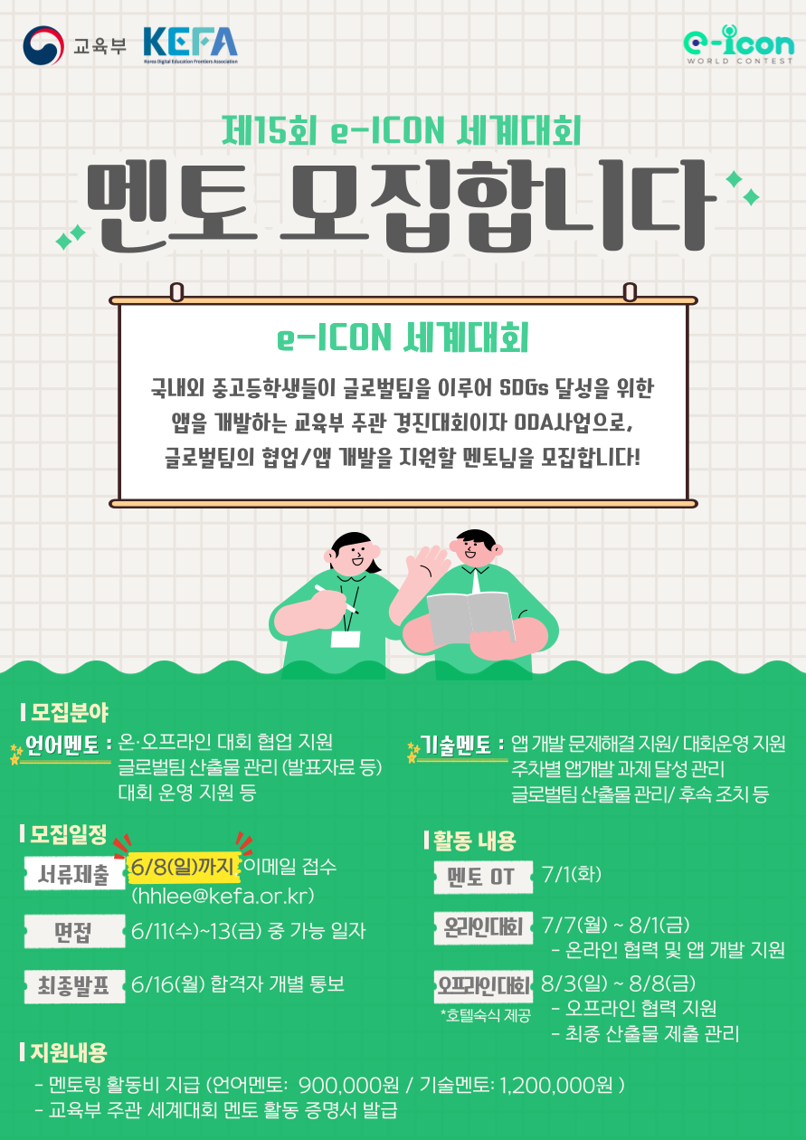 교육부에서 주관하고 한국디지털교육협회(KEFA)에서 주최하는 e-ICON 세계대회의 멘토를 모집합니다!