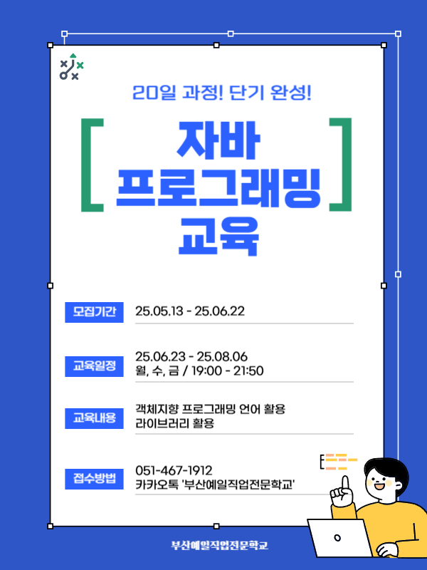 기초부터 자바 프로그래밍을 배우고, 자격증 대비 및 취업 매칭까지 지원받을 수 있는 실무 중심 교육입니다.