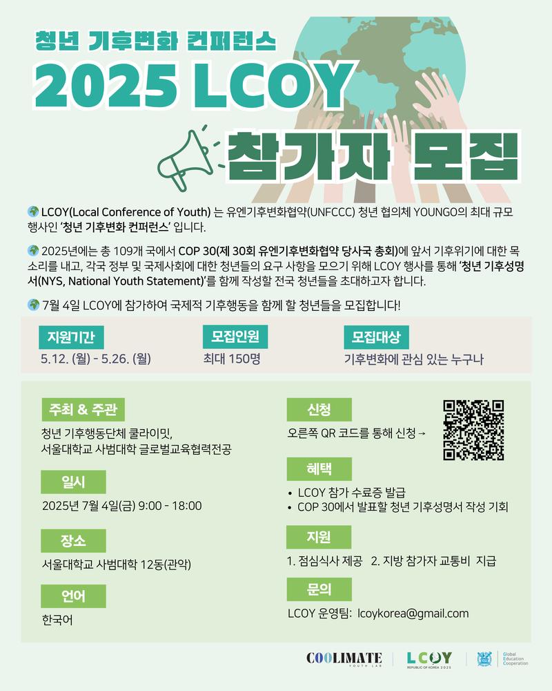 유엔기후변화협약(UNFCCC)의 공식 청년 기후변화 컨퍼런스, 2025 LCOY KOREA의 참가자를 모집합니다!