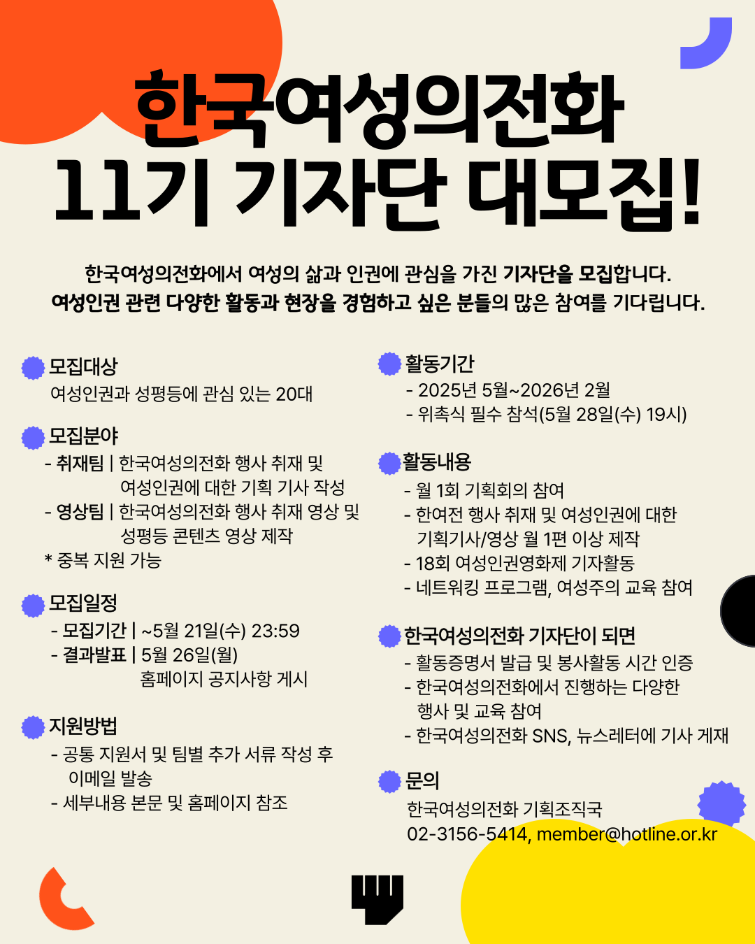 - 한국여성의전화 기획조직국 02-3156-5414, member@hotline.or.kr