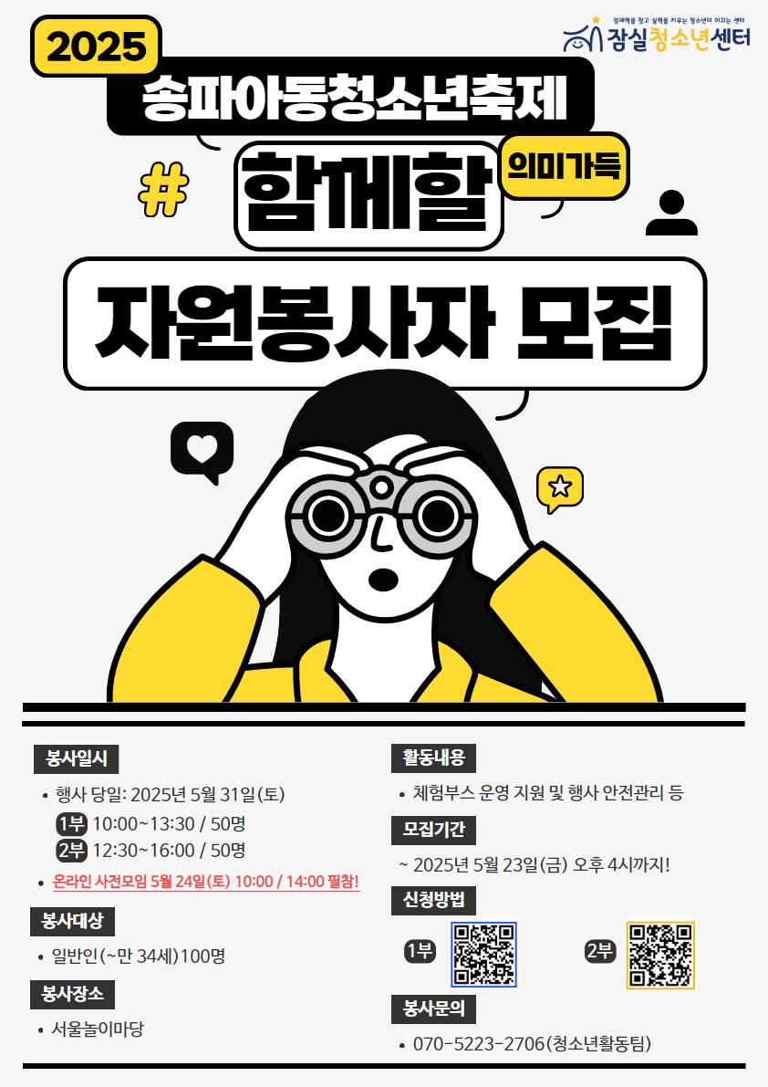 [제 10회 송파청소년축제 체험부스 운영 지원 및 안전관리 자원봉사자 모집]