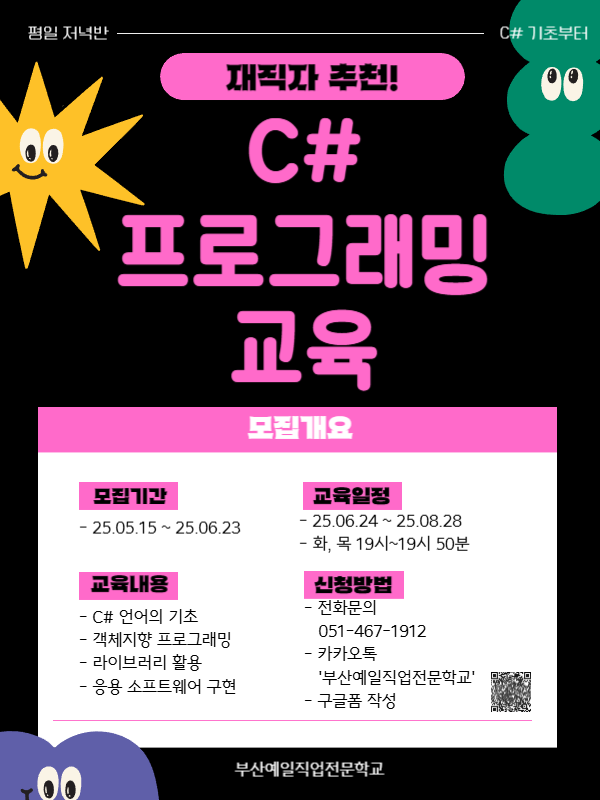 C# 언어의 기초부터 객체지향과 라이브러리 활용까지 익혀, 응용 소프트웨어를 개발하는 실무 중심 교육입니다.