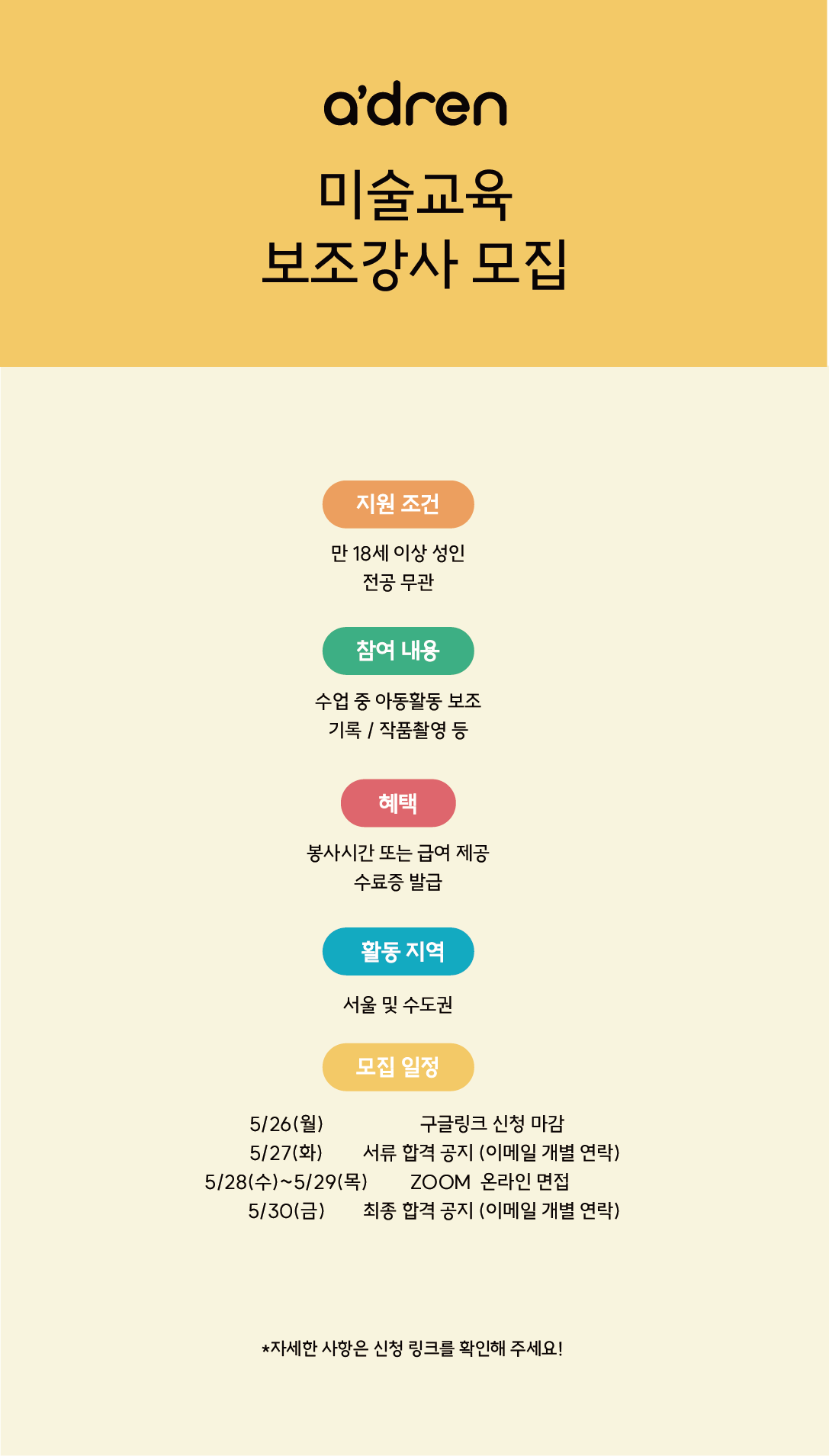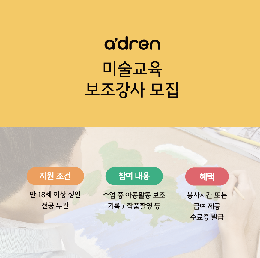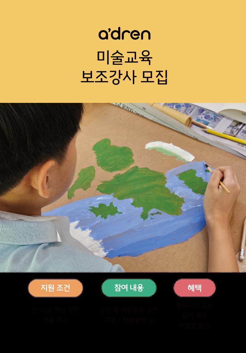 에이드런의 미술수업 보조강사를 모집합니다.