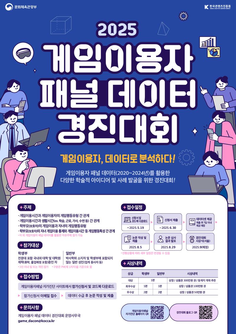 한국콘텐츠진흥원은 대규모 종단조사인 게임이용자 패널 데이터를 활용하여, 게임이용자의 행태를 분석하는 다양한 학술적 아이디어와 사례를 발굴하고자 합니다.