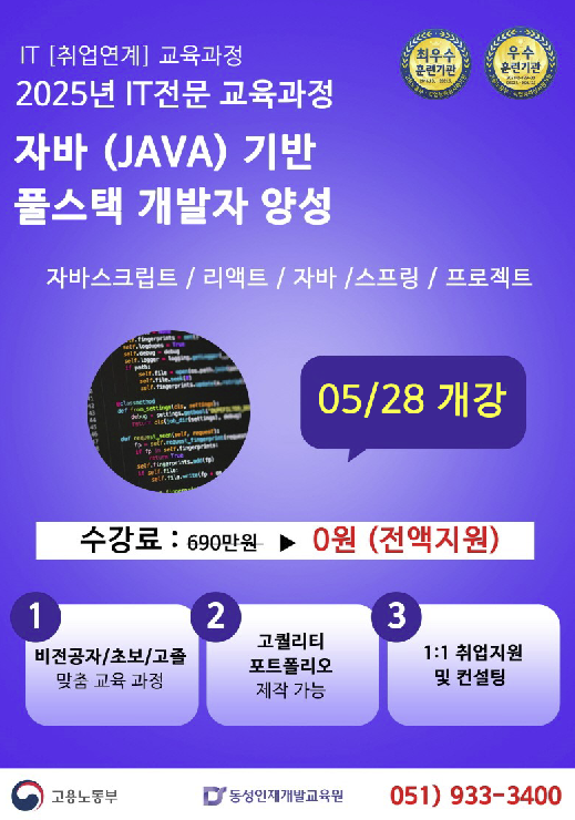 #부산코딩학원 #서면코딩학원 #부산IT학원 #서면IT학원 #부산자바학원 #서면자바학원 # #부산스프링학원 #서면스프링학원 #부산자바스크립트 #서면파이썬학원 #자바학원 #파이썬학원 #IT학원 #부산IT국비학원 #부산국비학원 #서면국비학원 #웹개발자학원 #동성인재개발교육원 #서면동성인재개발교육원 #부산동성인재개발교육원 #부산국비무료