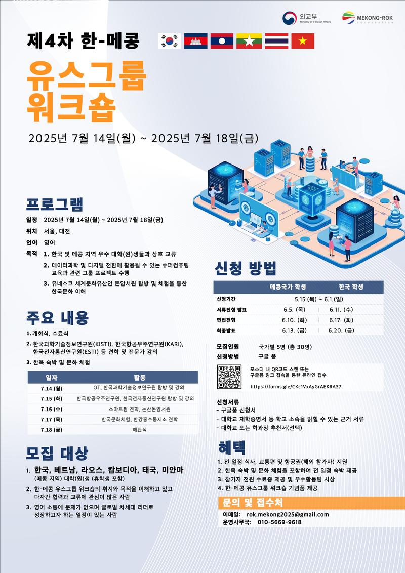 메콩 지역(베트남, 라오스, 캄보디아, 태국, 미얀마)과 함께 대한민국 외교부가 주최하는 제4차 한-메콩 유스그룹 워크숍에 참가하여 다양한 배경을 가진 참가자들과 함께 국제 현안에 관한 생각을 나누고, 글로벌 변화를 이끄는 차세대 리더로 성장할 뜻깊은 기회를 경험하시길 바랍니다!