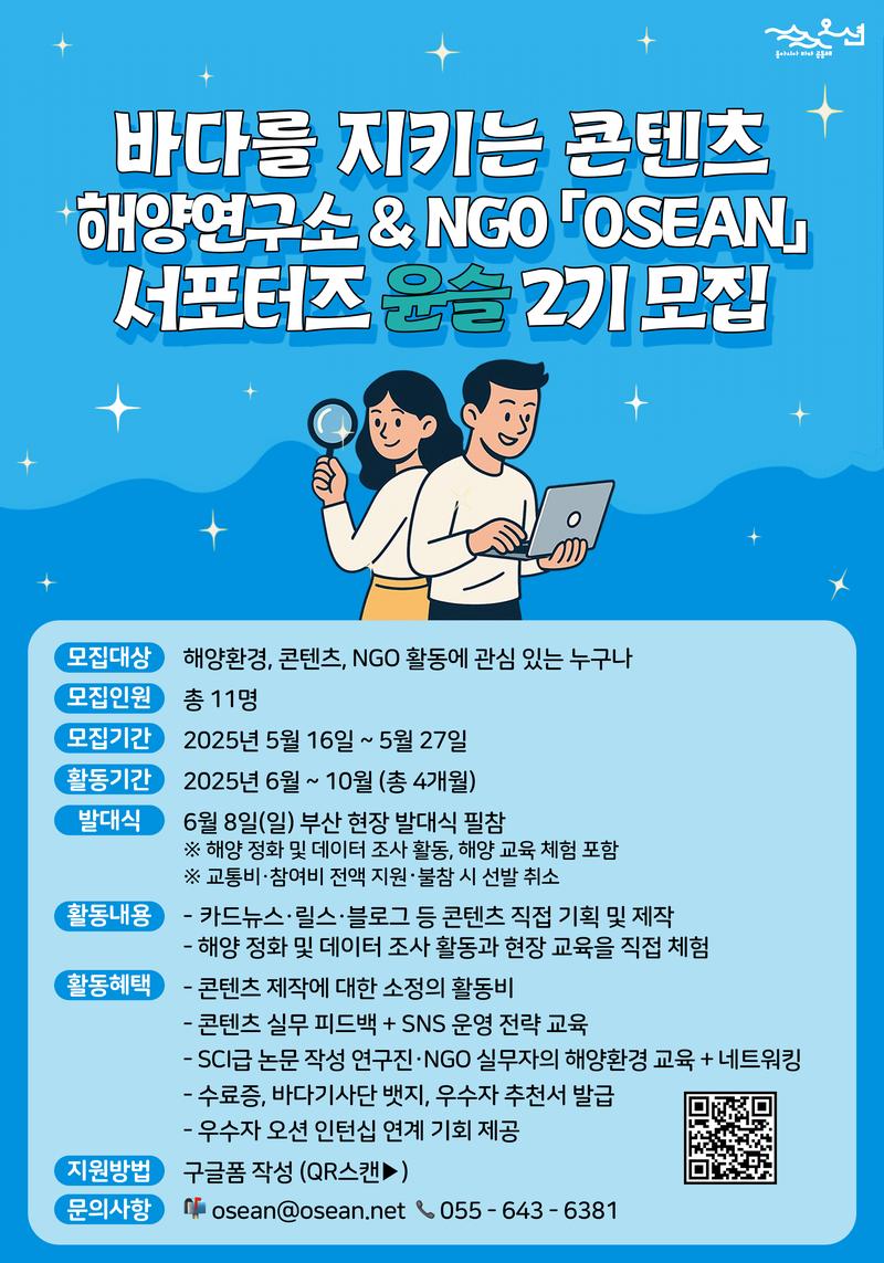 오션(OSEAN)은 유엔환경계획(UNEP) 인증을 받은 비정부기구로, 해양 쓰레기 문제 해결을 위해 연구, 정책 개발, 교육, 국제 협력을 수행하는 전문 연구소이자 NGO입니다.