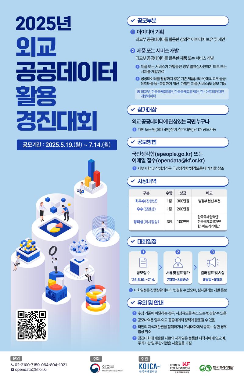 외교부(산하기관 포함, 이하 외교부)는 외교 공공데이터를 활용한 아이디어 기획 및 제품․서비스 개발로 데이터 기반 신규 창업을 촉진하고 데이터 경제 활성화에 기여하고자 아래와 같이「2025년 외교 공공데이터 활용 경진대회」를 실시합니다. 국민 여러분의 많은 관심과 참여를 바랍니다.