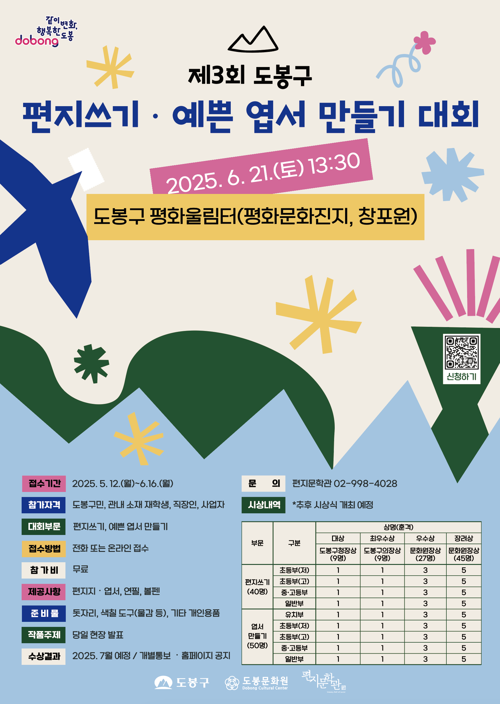 편지문학관은 인문가치를 바탕으로 올바른 손편지 문화를 확산하기 위해 <제3회 도봉구 편지 쓰기·예쁜 엽서 만들기 대회>를 개최합니다. 여러분의 많은 관심과 참여 부탁드립니다.